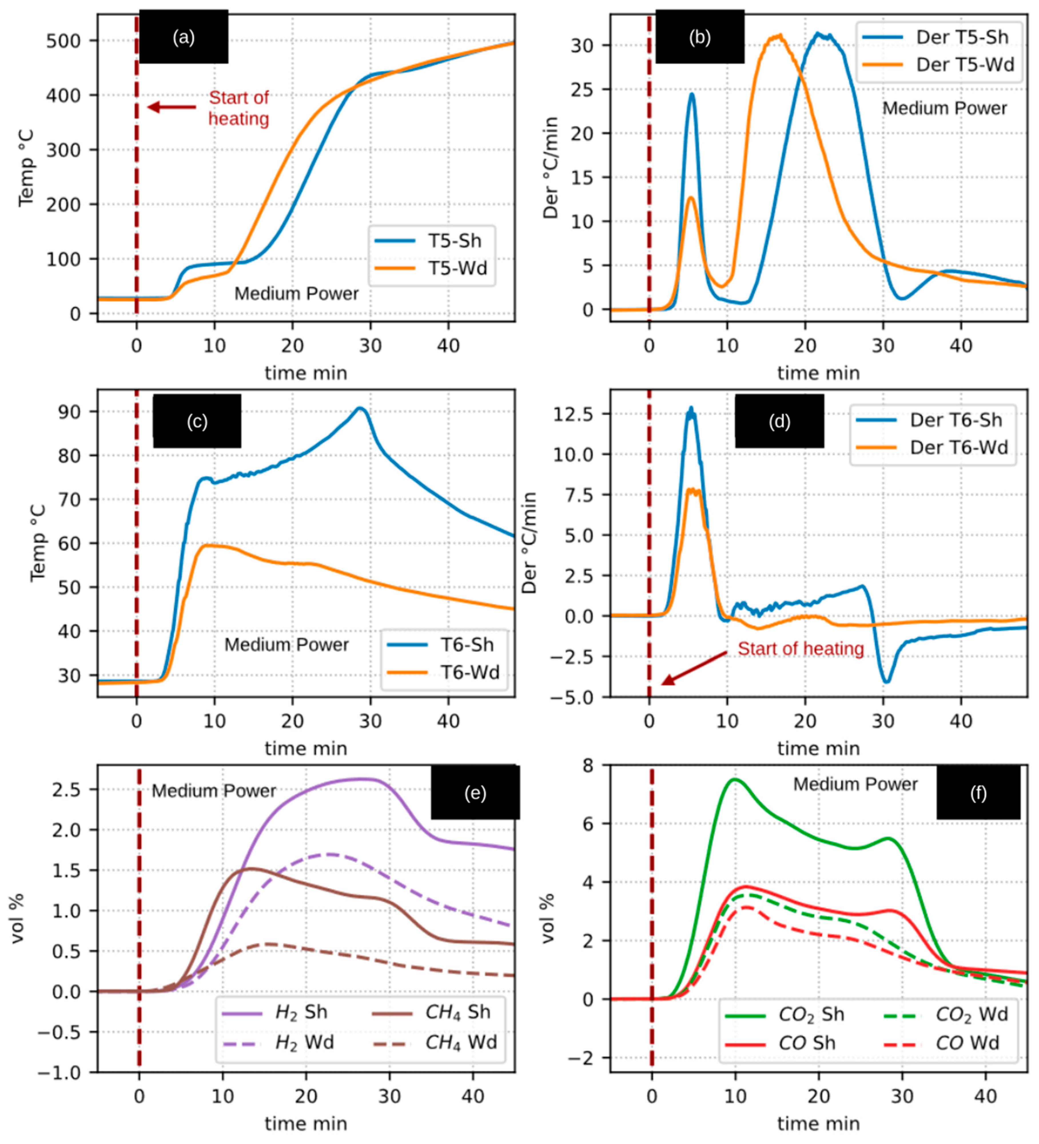 However, when these results are compared with those obtained from the walnut shell experiments (WSSP), it becomes evident that the thermal and derivative signals associated with WSSP are significantly more pronounced. Across all radiative power levels, the WSSP experiments exhibited clearer and sharper features, including the following: