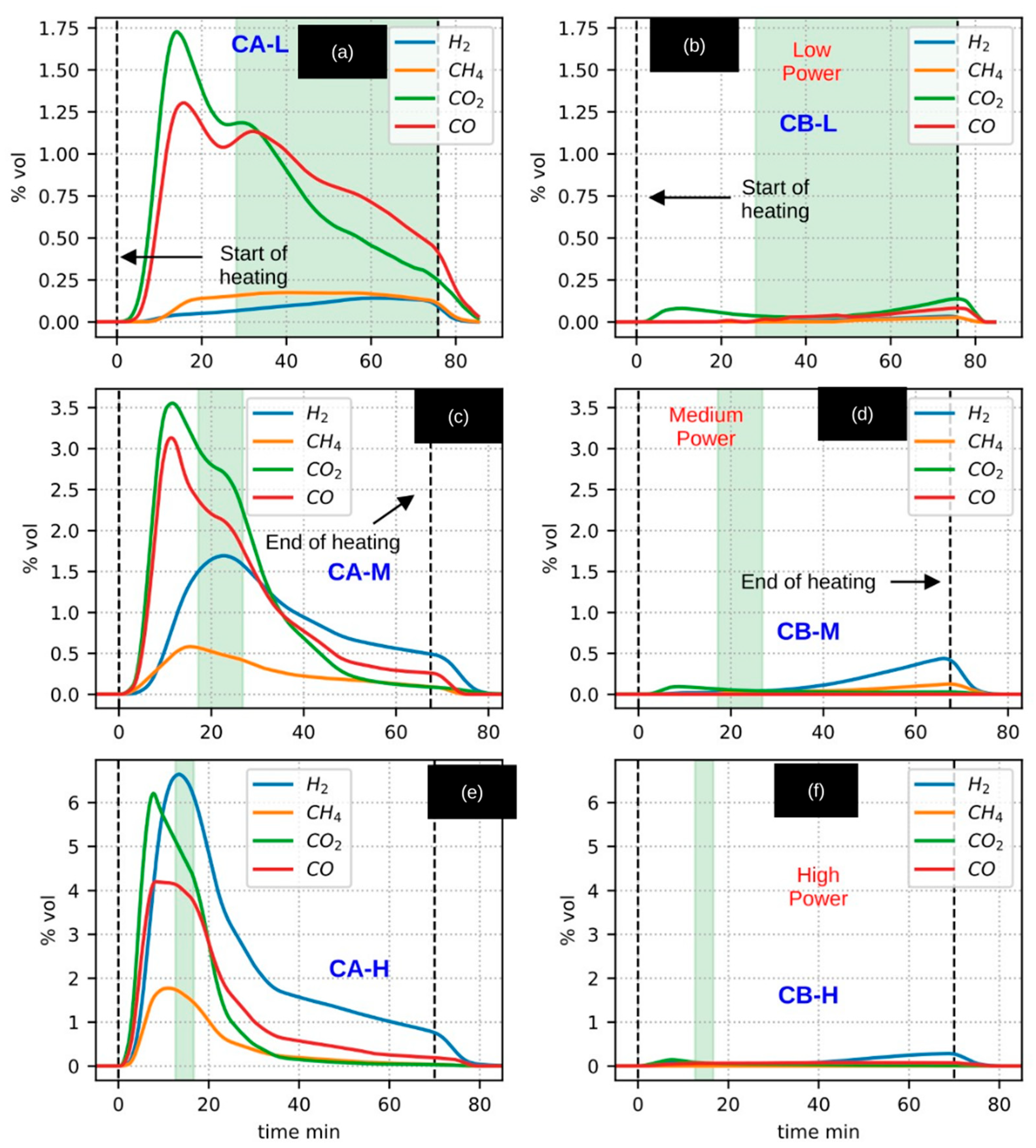 Figure 8, support this hypothesis. Under comparable temperature and radiative power conditions, gas production during the CaEX biochar heating experiments (CB) was observed to be up to 25 times lower than that recorded during the corresponding CA experiments. Moreover, no significant production peaks were detected for any of the monitored gaseous species (H
