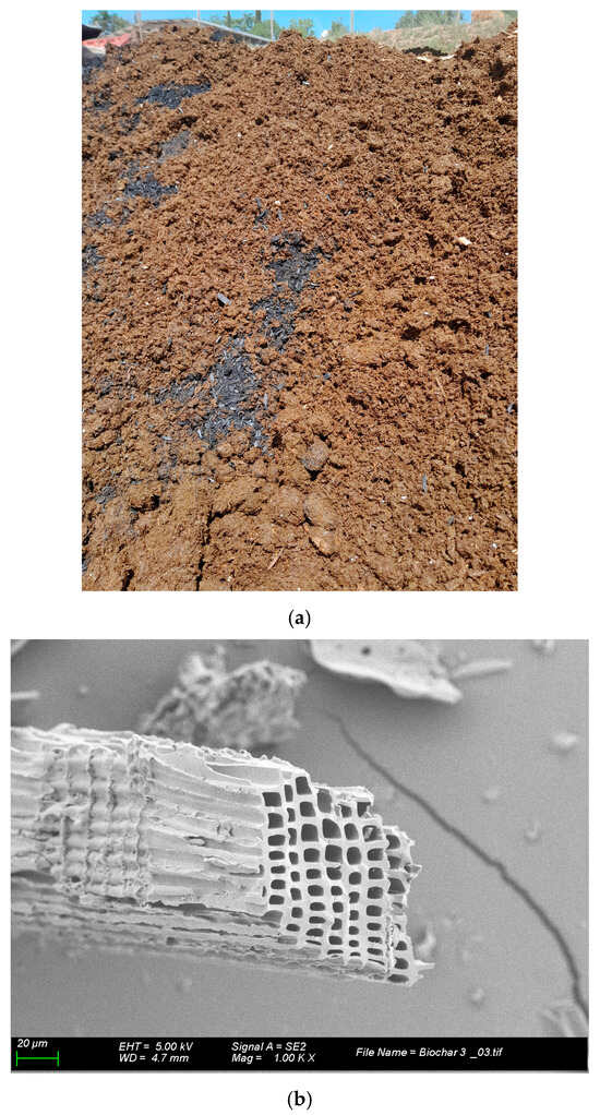 Macroscopic (a) and microscopic (b) SEM (scanning electron microscope) images from woody biochar (Figure 1a is of biochar in a manure composting pile).