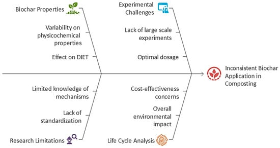 However, there are several unknowns regarding the application of biochar in different processes, including the biological treatment of organic waste and its consequent emissions. The first area of disagreement concerns the optimal dosage or application rate of a material that is often not well characterized. It is important to regulate the dosage as well as the physicochemical properties of the biochar and the operational conditions of the process, to avoid undesirable effects. Typically, biochar is added at the start of the process and mixed simultaneously with the bulking agent. Limited research has been conducted on the benefits, challenges and realistic possibilities of integrating the biochar gradually or at different moments of the process [85]. Another important issue is the absence of works conducted at full- and large-scale, which is a critical aspect of composting, as scaling up changes the temperature profiles in the composting mass [32,51] and, consequently, the emission patterns of almost all gases emitted during composting [8,9]. The mitigation of gaseous emissions brings a sustainability benefit; however, it might not compensate if an extensive pretreatment of biochar is needed. Figure 2 summarizes these knowledge limitations and their consequences for the full development of biochar as a composting additive, as is the case with its use in anaerobic digestion [86].