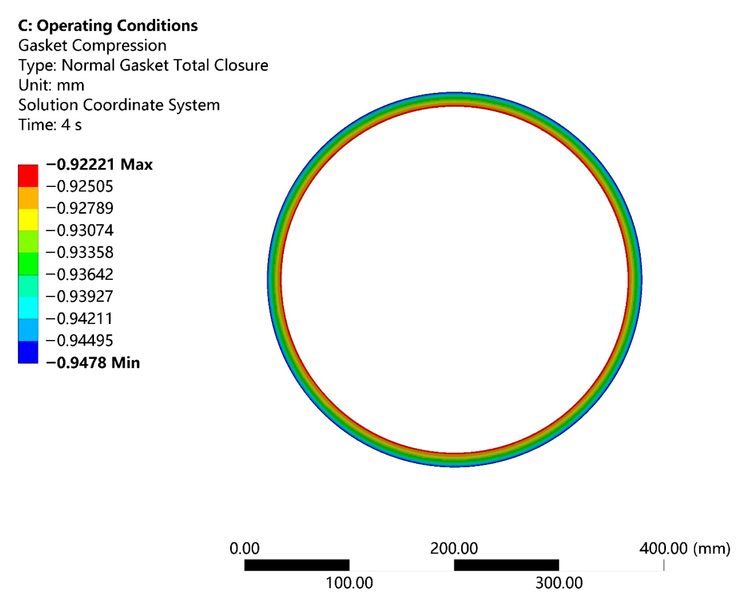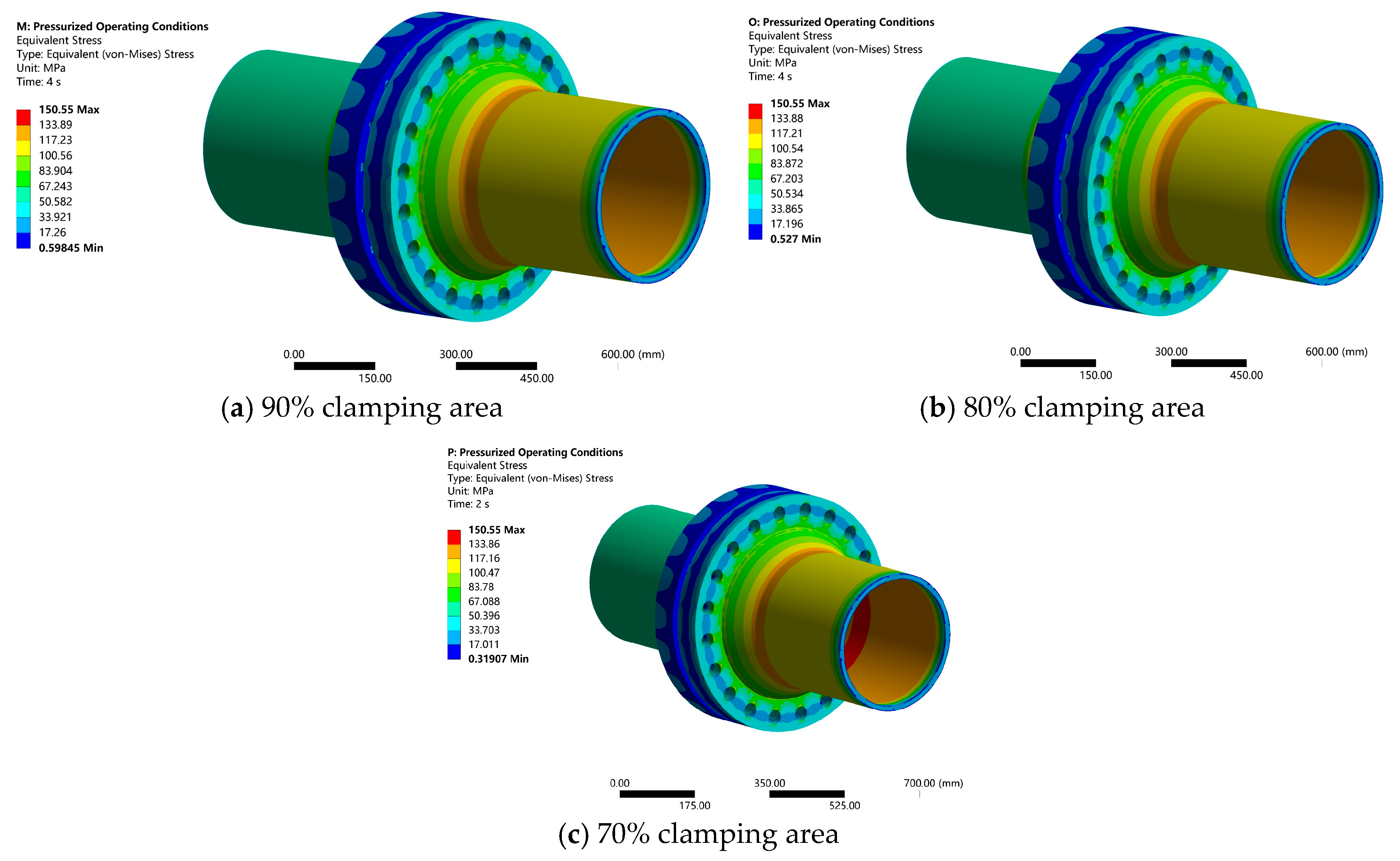- Gasket Compressive Stress: According to GB150 [22] and ASME VIII-1 [31] standards, the gasket compressive stress should satisfy (where m is the gasket factor and p is the internal pressure) to meet the sealing requirements. Moreover, the larger the effective sealing area and the more uniform the stress distribution, the better the sealing performance [32].