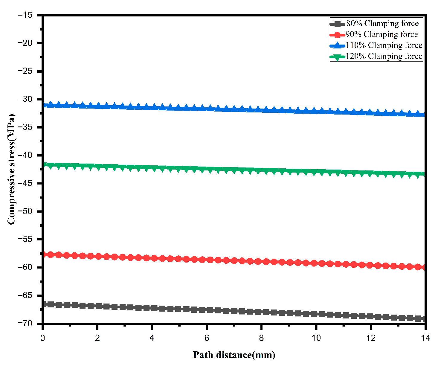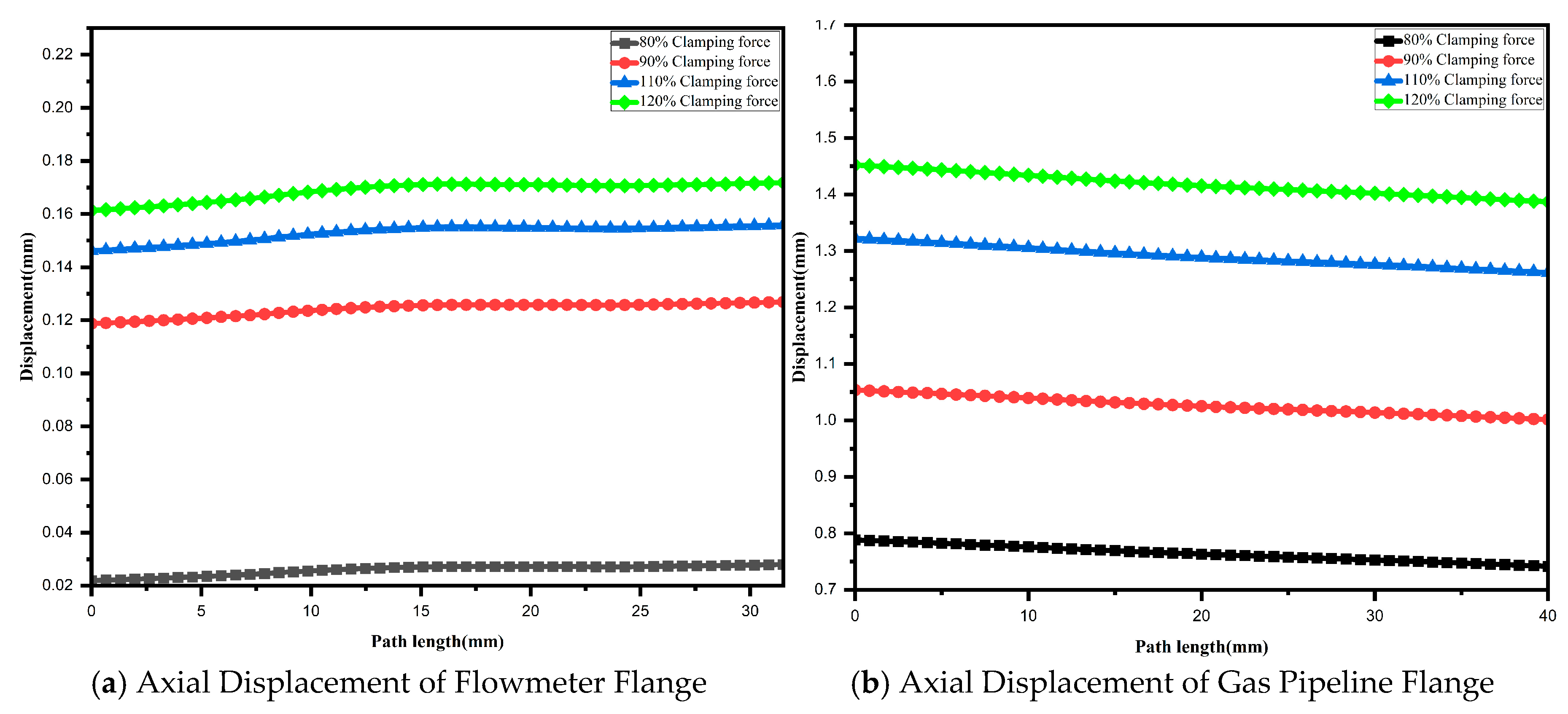 - Simulation results demonstrate that both the clamping area and clamping force significantly influence sealing performance. When the clamping area is reduced below 80% of the design value, stress concentration causes the maximum stress in the flowmeter flange to rise to 136.73 MPa, leading to a marked degradation in sealing performance. Similarly, reducing the clamping force to 80% of the design value lowers the minimum compressive stress in the gasket to approximately 31 MPa, bringing the seal to the brink of failure. Although increasing the clamping force to 120% enhances sealing redundancy, it diminishes the strength margin of components such as the flange. Therefore, during operation and maintenance, it is recommended to maintain the clamping force within 90–110% of the design value while ensuring an effective clamping area of at least 80%. This approach optimally balances sealing reliability with structural strength and safety.