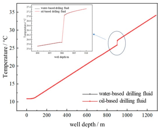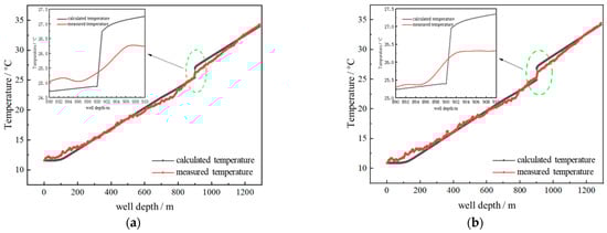 Compare the temperature distribution from 200 m to 900 m; the temperature curve of computation is a straight line, while the test temperature cure shows significant fluctuations. The reason is that the rough wellbore affects the flow of drilling fluid and the heat transfer is complex. It can be calculated that the temperatures are 0.37 °C and 0.26 °C for 400 L/min and 800 L/min, respectively.