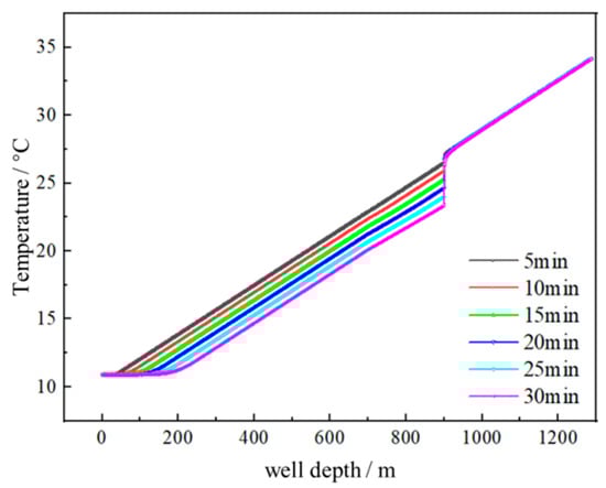 Figure 4 illustrates the temperature distribution curves of the wellbore following the continuous injection of various drilling fluids over different durations. When the drilling fluid injection rate is set at 5 L/s, the impact depth at the wellhead increases from 47 m to 170 m as the time progresses from 5 to 30 min. Concurrently, above the leaky layer, the temperatures of the drilling fluid in both the casing and open-hole sections decrease by 2.8064 °C and 3.0643 °C, respectively. Below the leaky layer, the temperature of the drilling fluid in the open-hole wellbore remains largely unaffected by time. At the location of the leaky layer, a longer continuous injection time of drilling fluid results in a more significant temperature difference. Specifically, when the continuous injection time is 5 min, the temperature difference across the leaky layer is 0.6398 °C, which increases to 2.7004 °C when the time is extended to 30 min. With a constant flow rate and consistent wellbore structural parameters, the volume of drilling fluid injected into the wellbore is directly proportional to the injection time. Consequently, a greater outflow volume leads to increased heat removal, resulting in a more pronounced temperature difference at the leaky layer and providing a more accurate indication of its location.