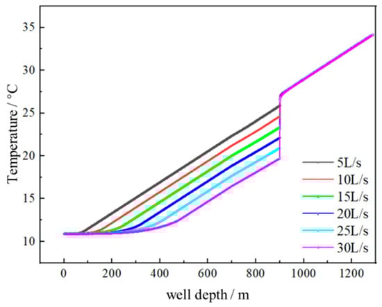 When the injection time is maintained at 5 min, the effect of the drilling fluid flow rate on the wellbore temperature distribution is illustrated in Figure 5. At a flow rate of 5 L/s, the temperature of the drilling fluid above the leaky layer is 25.8851 °C. However, as the flow rate increases to 30 L/s, the temperature decreases to 19.7132 °C, causing the temperature difference across the leaky layer to rise from 1.1601 °C to 6.595 °C. Under these conditions, a higher flow rate results in increased drilling fluid leakage, which enhances heat removal over the same duration, leading to a more pronounced temperature drop in the wellbore.