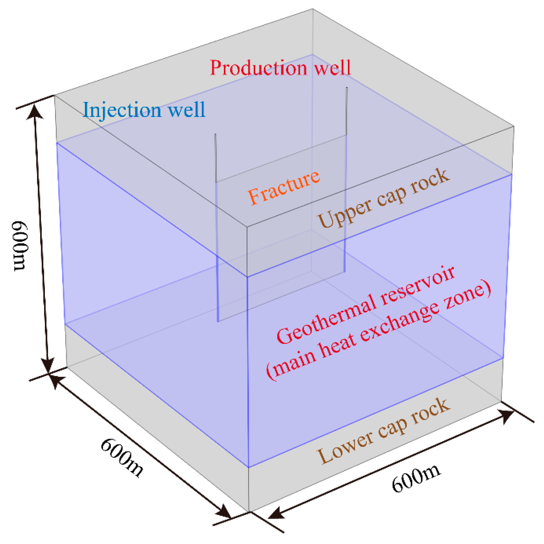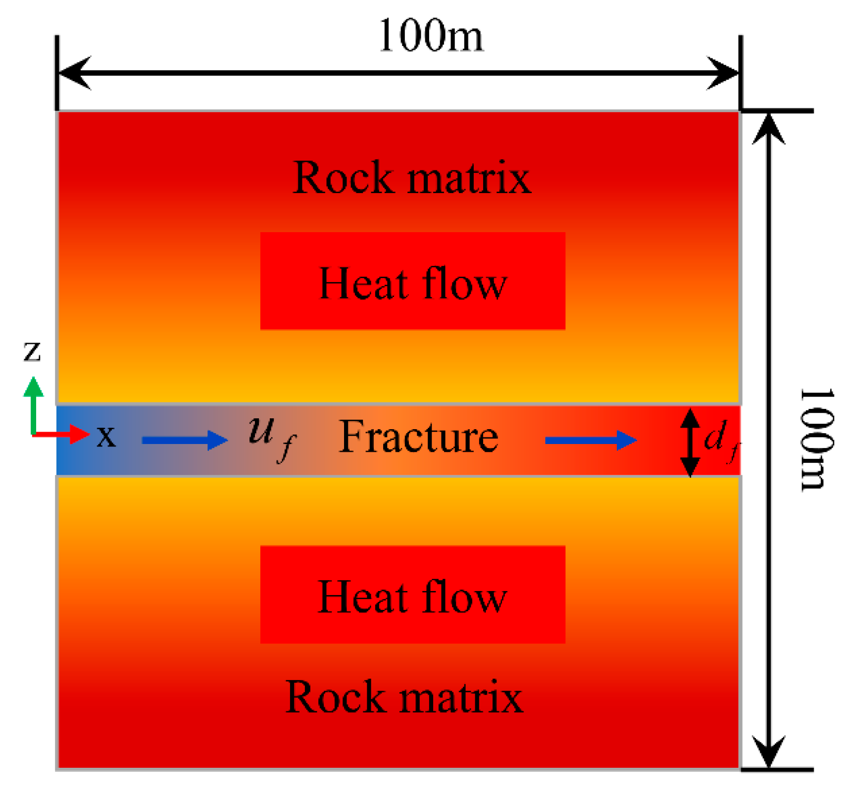 - It is assumed that no chemical reactions occur between the rock matrix and the circulating fluid, including dissolution, precipitation, redox reactions and other chemical processes. In addition, no additional heat is generated throughout the process, and the impact of thermal radiation is not considered for the time being [31].
