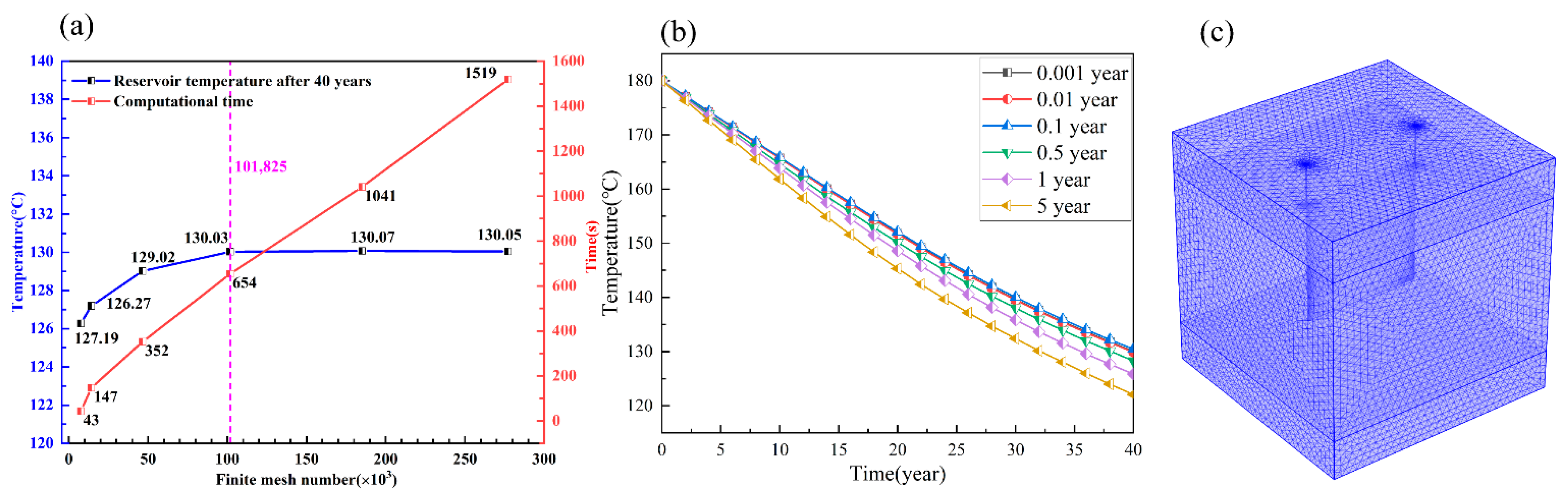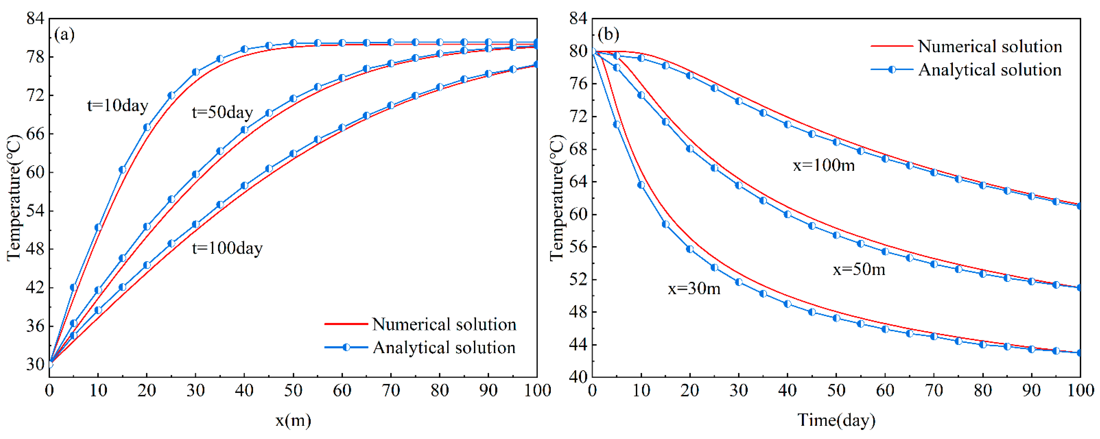 - Rocks and fluids in local regions are in a state of thermal equilibrium [29], and this equilibrium relationship explains the heat transfer mechanism between them [30]. Meanwhile, assuming that low-temperature fluids do not dissipate rapidly and remain stationary during the shutdown phase of geothermal exploitation, the hypothesis of local thermal equilibrium remains valid.