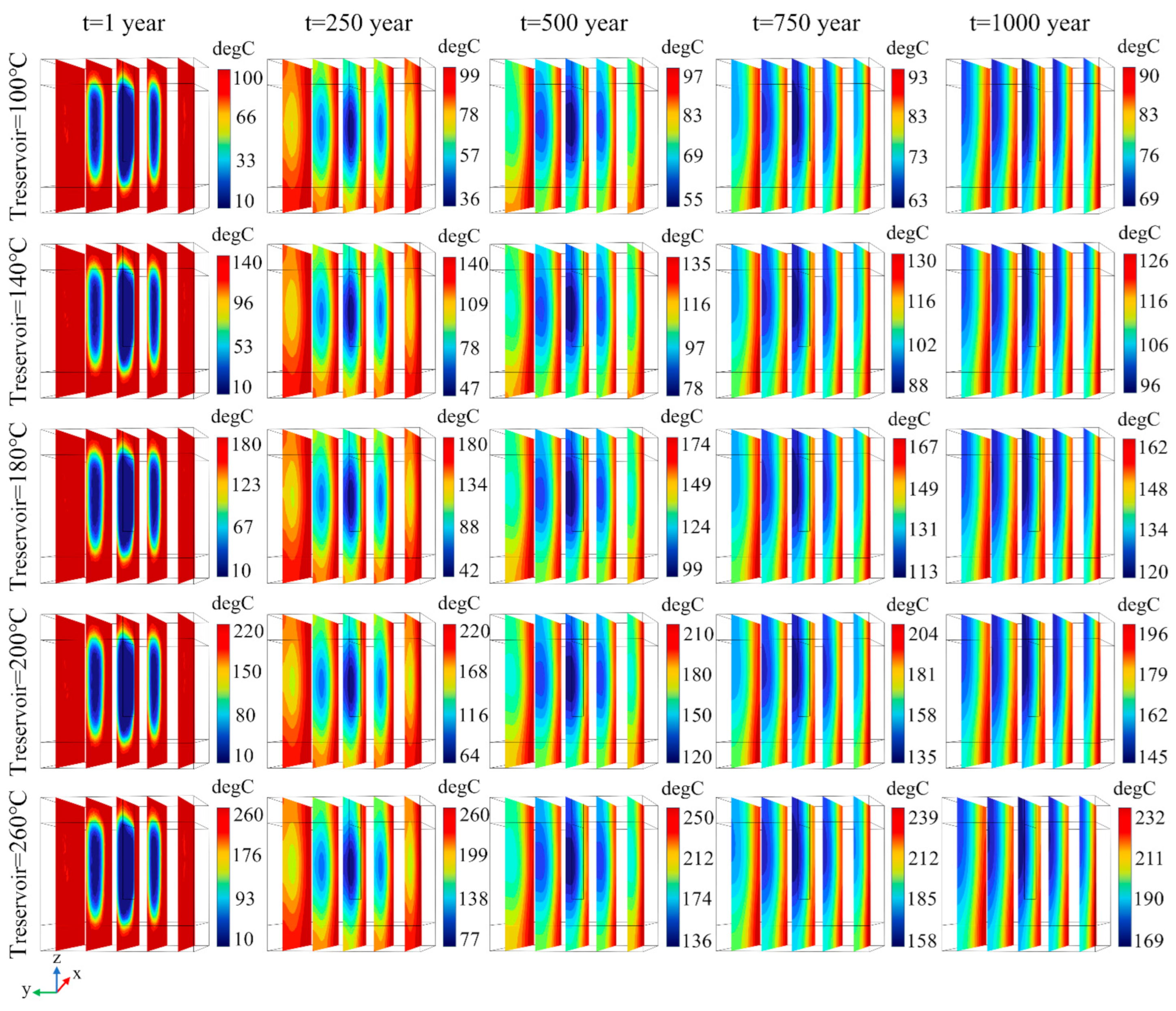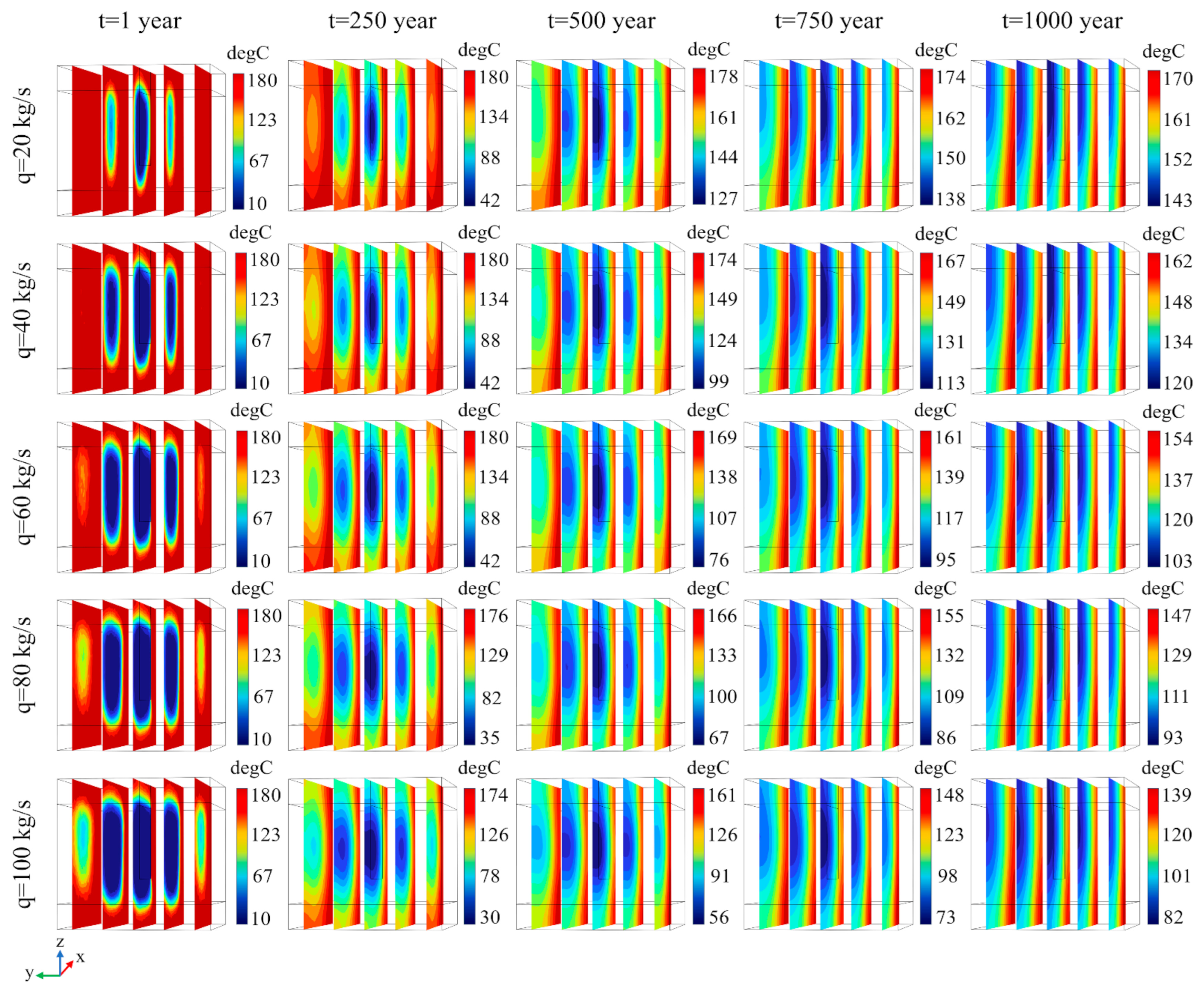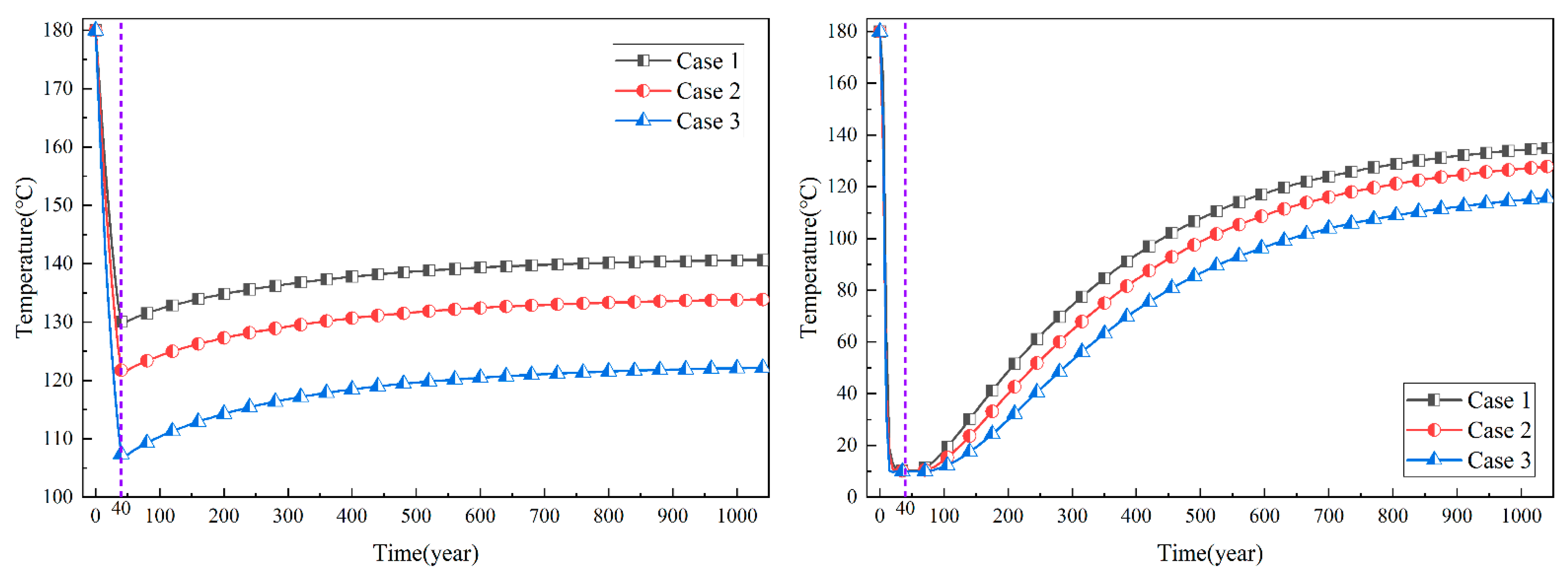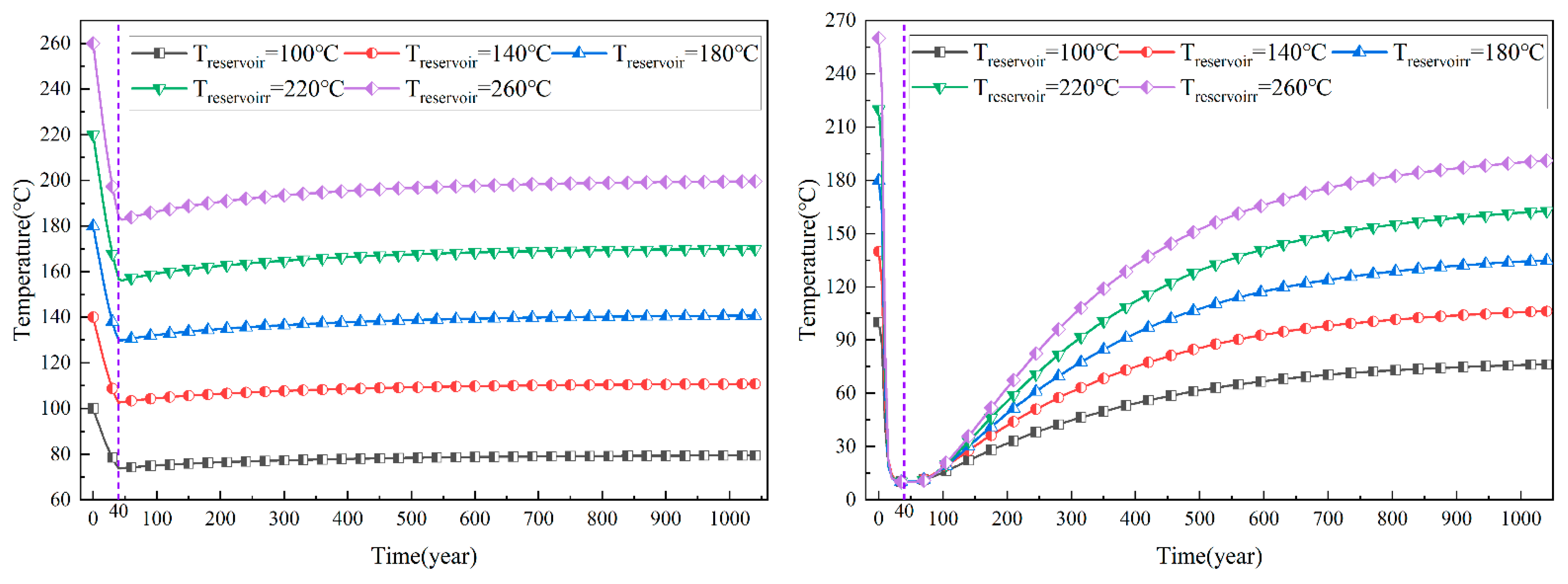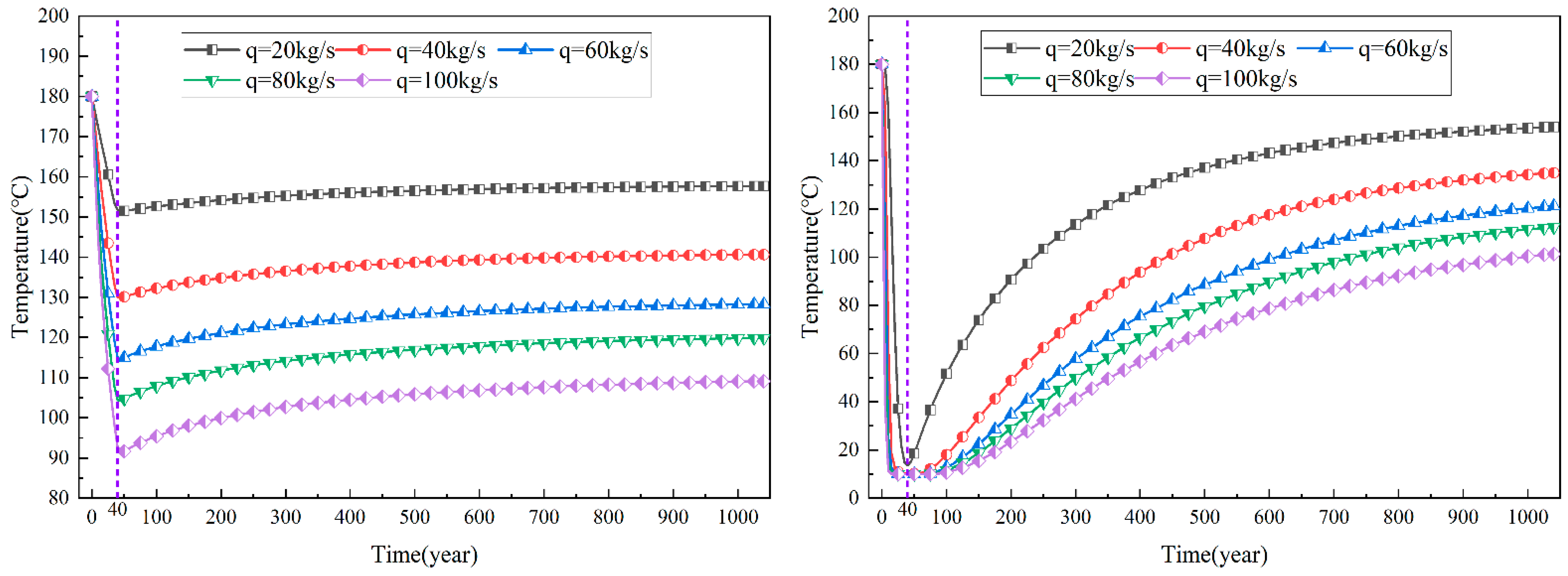 - Lower flow rates accelerate reservoir temperature recovery and yield higher final temperatures, while higher flow rates slow recovery and reduce final temperatures. When the flow rate increases from 20 kg/s to 100 kg/s, the temperature recovery rate rises from 3.94% to 17.6%. However, the final temperature relative to the initial reservoir temperature decreases from 87.62% to 60.63%.