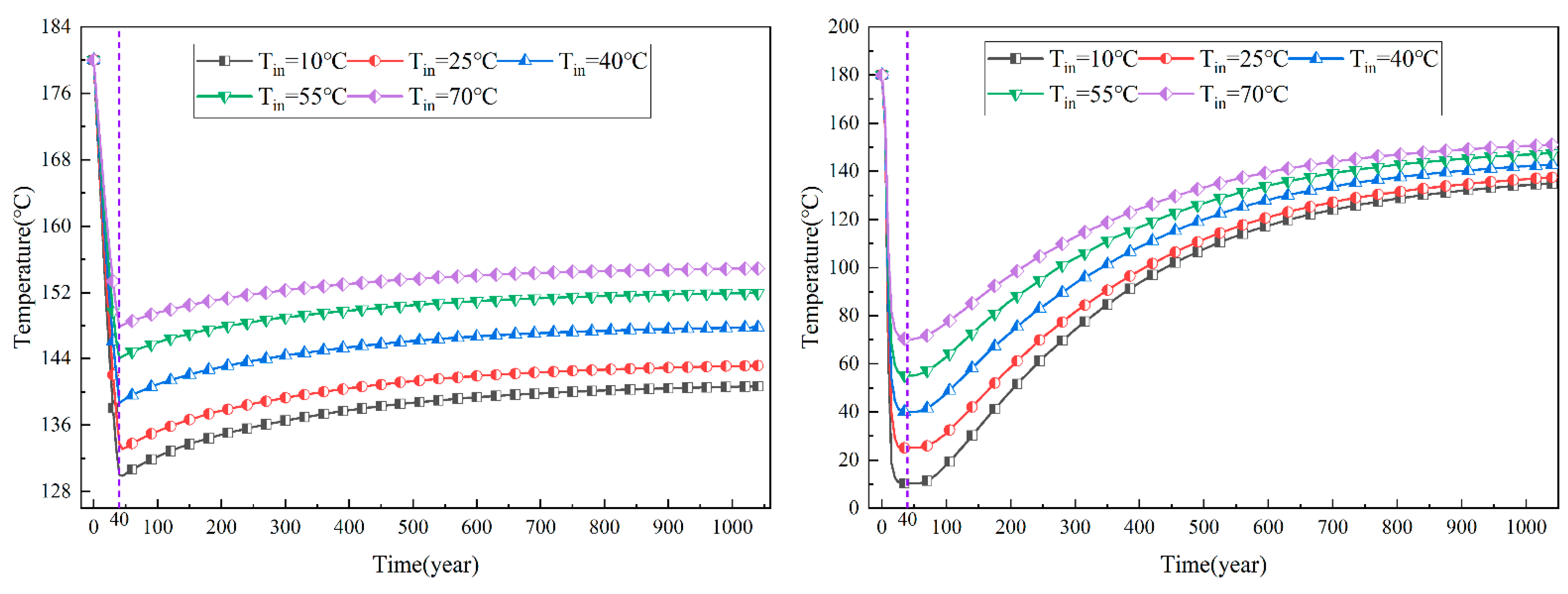 - As injection temperature increases from 10 °C to 70 °C, the temperature rebound during shut-in decreases from 10.65 °C to 7.05 °C, but the final recovered temperature improves from 78.16% to 86.07% of the initial temperature. The temperature differential between injection and reservoir dictates extraction intensity and thermal depletion. A smaller differential (70 °C injection) results in a lower rebound magnitude but preserves reservoir thermal integrity, achieving a higher final recovery ratio. A larger differential (10 °C injection) triggers a stronger rebound but causes deep thermal damage, limiting the ultimate recovery level.