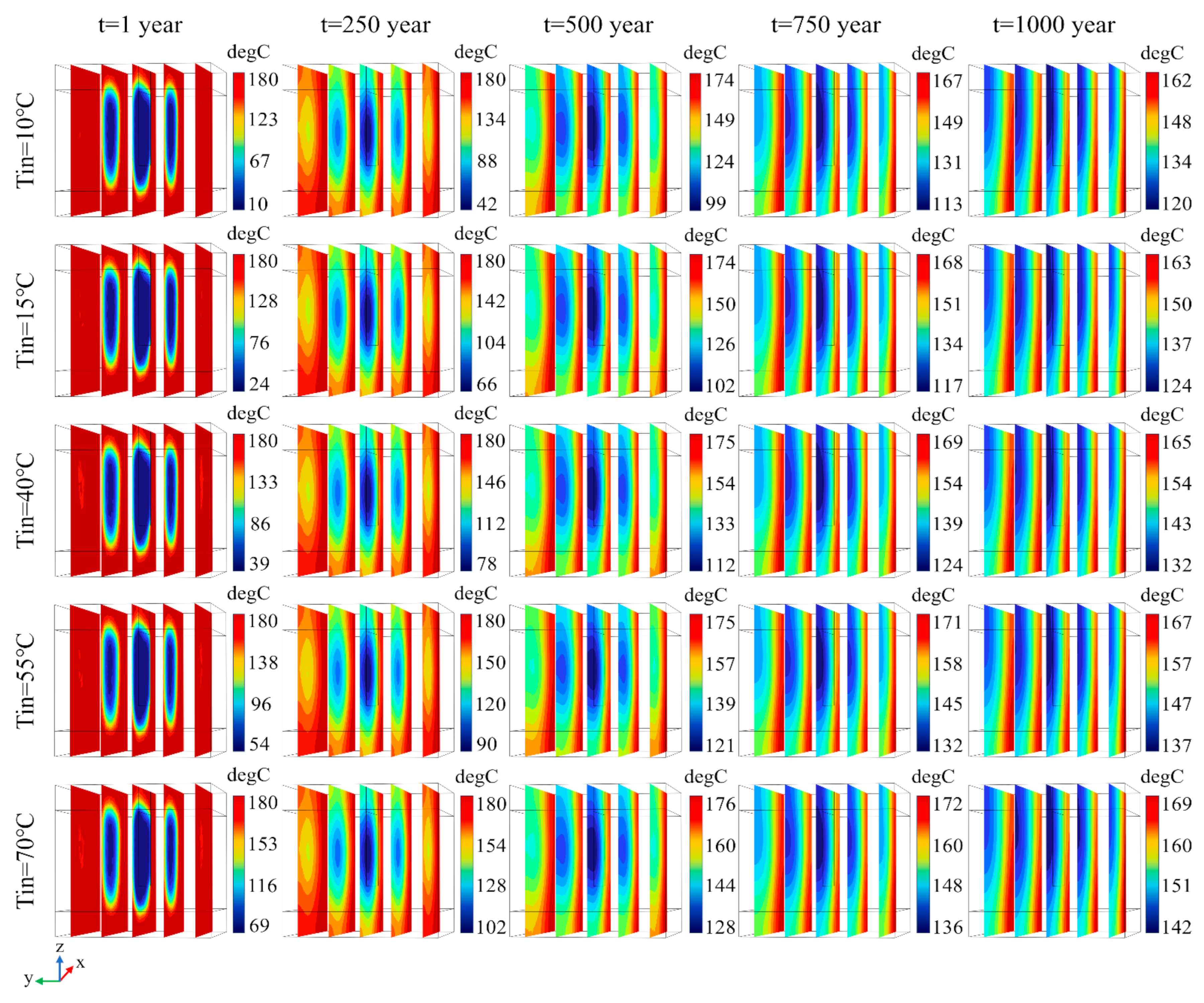 - After 40 years of EGS geothermal production, natural temperature compensation over the 1000-year shut-in period fails to restore the reservoir temperature to its initial level. Under various parameter conditions, the temperature recovers only to 60.63–89.51% of the initial reservoir temperature.