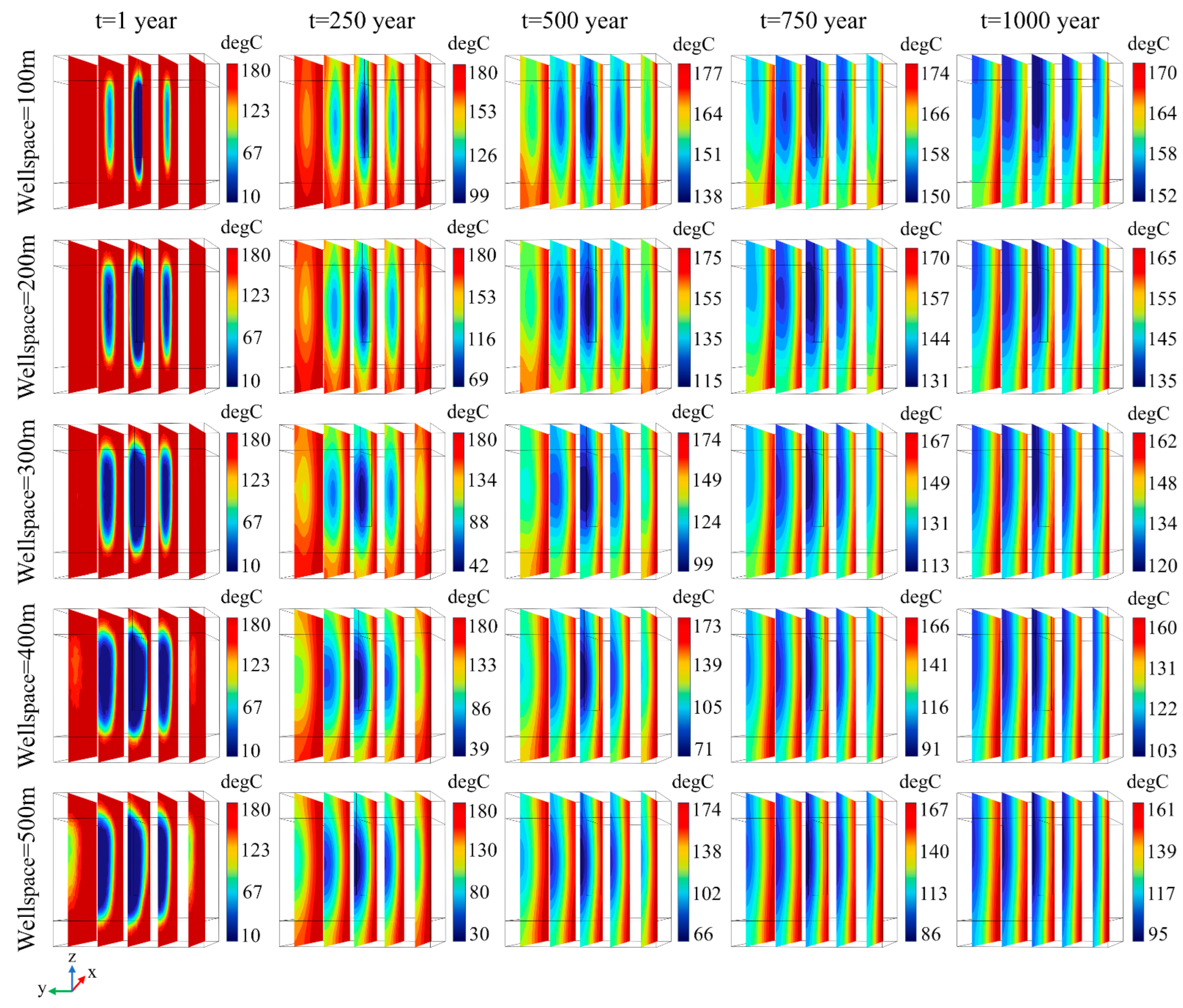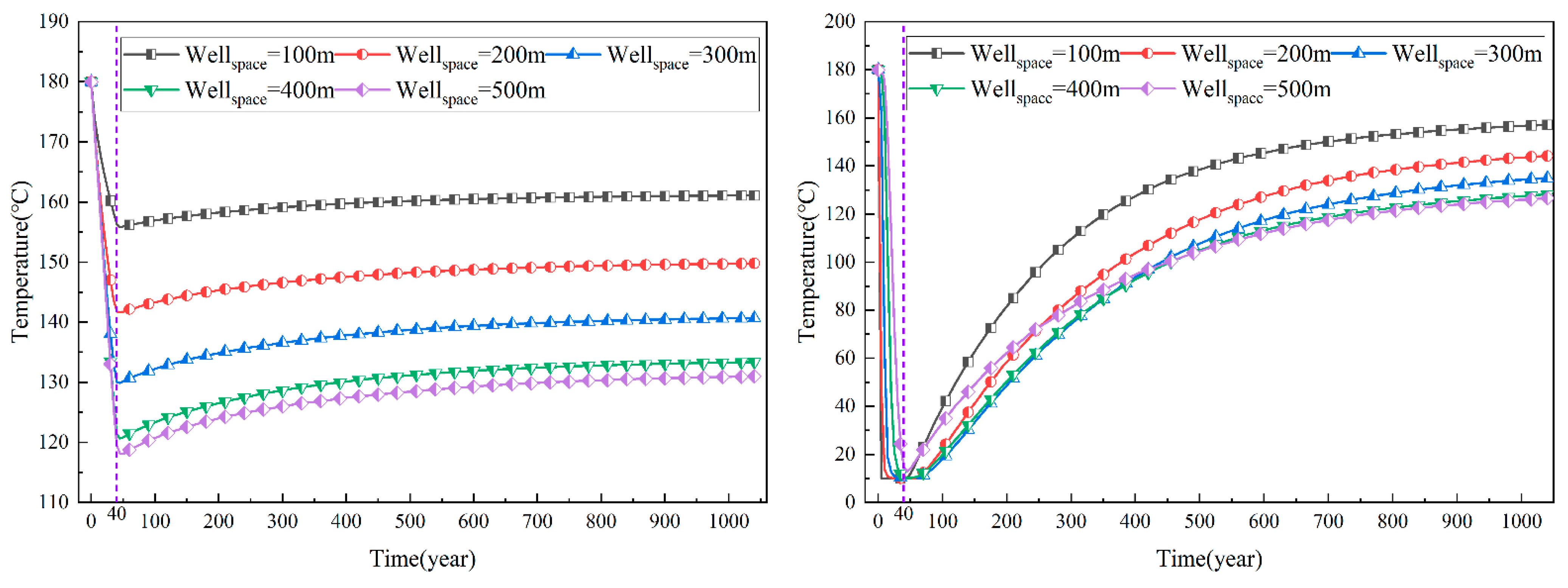 - Increasing well spacing from 100 m to 500 m raises the temperature rebound magnitude from 4.76 °C to 11.48 °C, but reduces the final recovered temperature from 89.51% to 72.77% of the initial temperature. Tighter spacing (100 m) causes localized thermal depletion but enables more efficient caprock heat compensation during shut-in, maintaining a higher final temperature of 161.11 °C. Wider spacing (500 m) yields a larger rebound magnitude but suffers from reduced compensation efficiency due to widespread thermal depletion, resulting in a final temperature of only 130.98 °C. Therefore, moderately reducing well spacing is more favorable for achieving effective long-term reservoir temperature recovery.