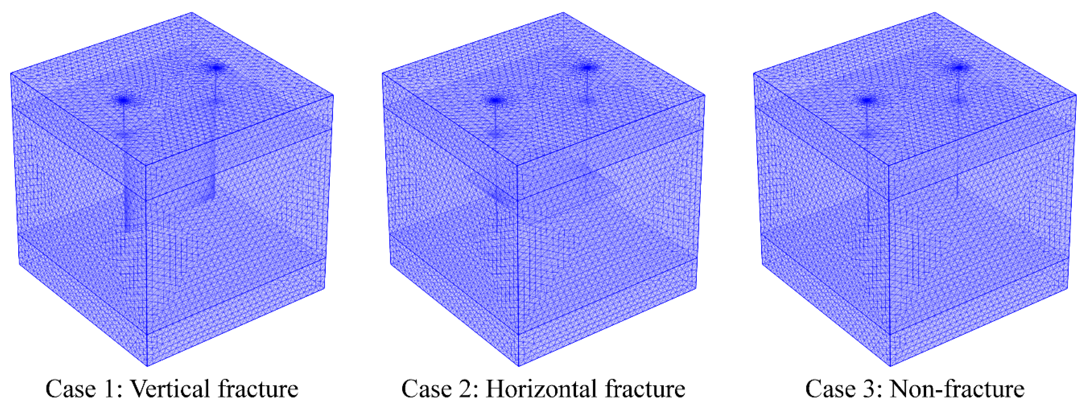 | Case 1 | Density (kg/m3) | Specific Heat Capacity (J/(kg·°C)) | Thermal Conductivity (W/(m·°C)) | Porosity | Permeability (m2) |