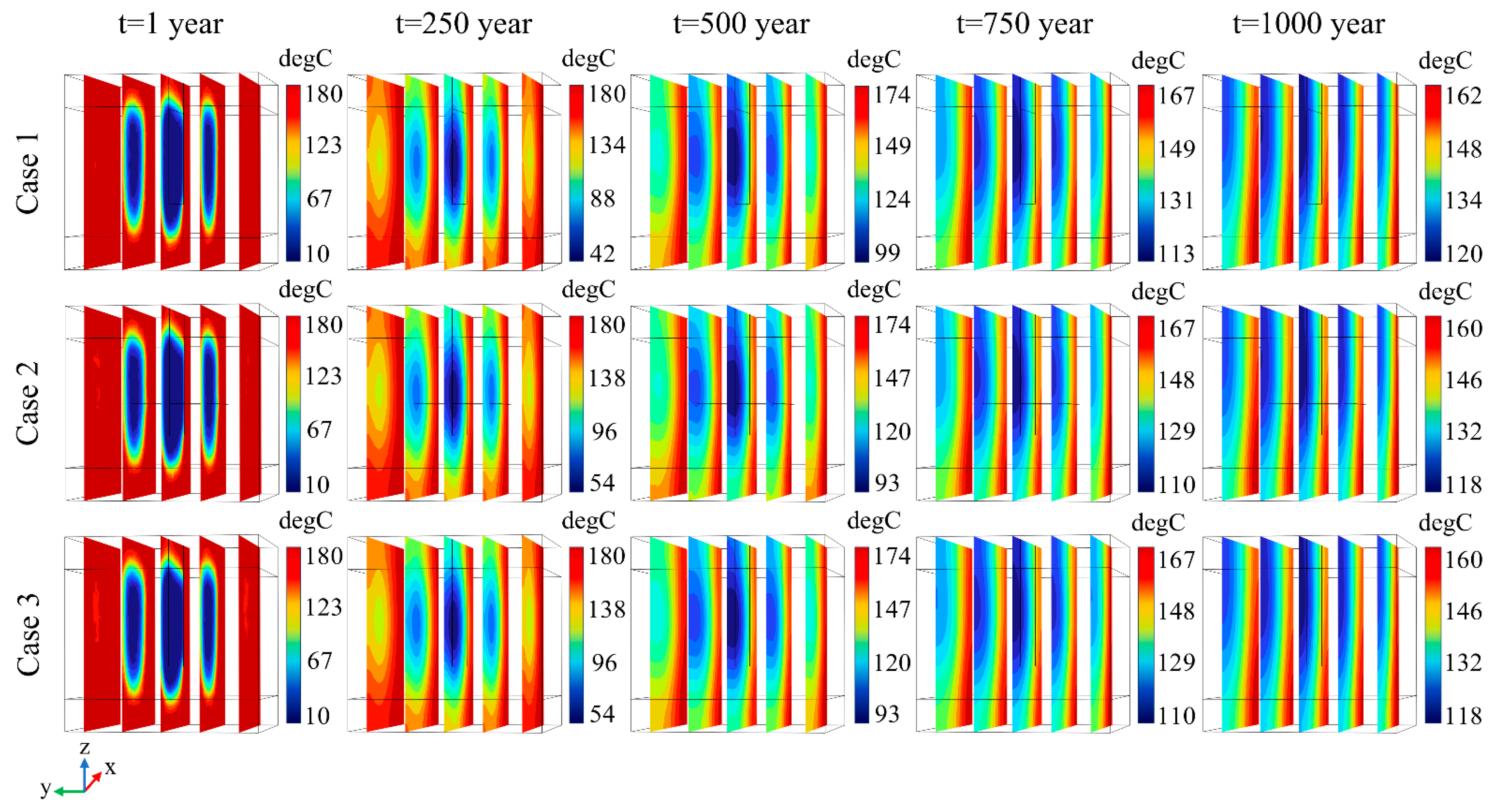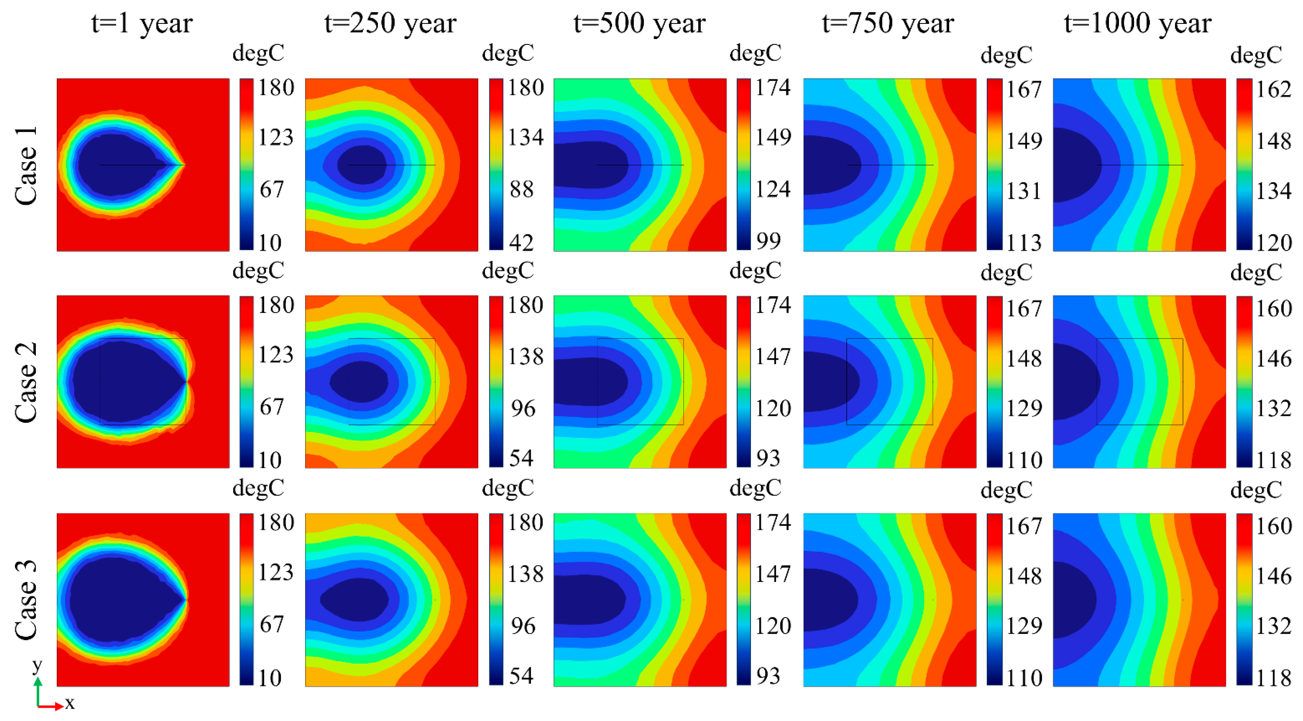 - In the study of natural reservoir temperature recovery after heat extraction cessation in dual-well EGS, the vertical fracture configuration recovered to 140.68 °C (78.16% of initial temperature) following a 1000-year shut-in period, the horizontal fracture configuration to 133.91 °C (74.39%), and the no-fracture configuration to 122.17 °C (67.87%). Owing to efficient heat flow transmission and superior thermal compensation characteristics, the vertical fracture configuration achieved the fastest recovery and highest final temperature, with the horizontal fracture configuration performing moderately, while the no-fracture configuration exhibited the slowest recovery and lowest temperature due to dispersed heat loss and elevated resistance to thermal compensation.