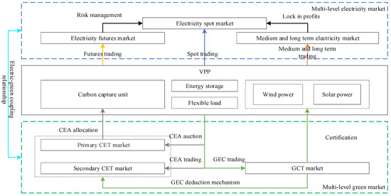 Ref. [6] establishes a market framework for thermal power to participate in the electricity futures market, the medium- and long-term electricity market, and the spot electricity market. Ref. [7] constructs a market framework for VPPs participating in internal and external electricity retail markets, the CET market, and the GCT market. Ref. [8] establishes a trading framework for VPPs participating in medium- and long-term contracts for the difference (CFD) and the GCT market. Ref. [9] constructs a market framework for VPPs participating in the electricity market, the CET market, and the China-certified emission reduction (CCER) market. Ref. [10] proposes a multi-level market framework for VPPs participating in the “medium- and long-term and spot” electricity market and the “primary and secondary” CET market, where internal resources of VPPs can sign medium- and long-term contracts with VPPs.
