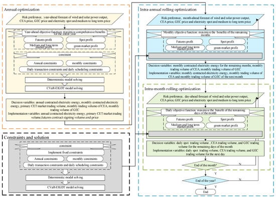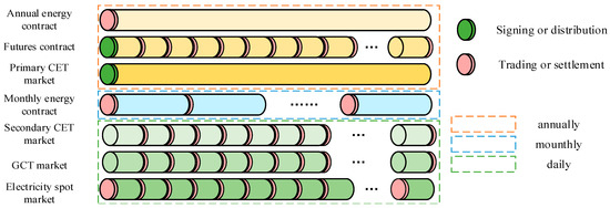 At the start of each year, VPPs sign annual energy contracts and electricity futures contracts, with free CEAs allocation in the primary CET market also conducted during this period. Futures contracts are evenly decomposed into daily contracts for settlement. Monthly energy contracts are signed at the beginning of each month. the spot market operates 24-h trading daily, while the secondary CET market and GCT market trade after the spot market closes.