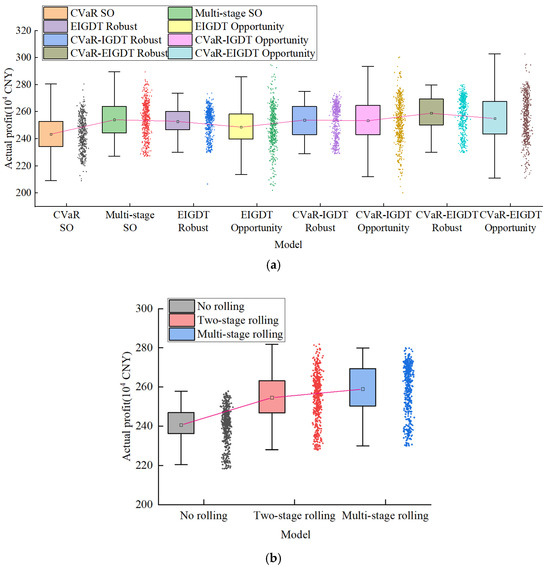 Actual profits of different decision-making models. (a) Comparison of multi-stage rolling decision-making models, (b) comparison of CVaR-EIGDT robust model.