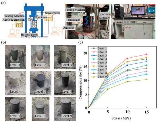 The compression test setup, prepared specimens, and test results are shown in Figure 4. The compression tests were conducted using a confined compression apparatus, as illustrated in Figure 4a. The specimen container has an inner diameter of 150 mm, a height of 300 mm, and a wall thickness of 20 mm. It is constructed from high-strength alloy steel, and its stiffness fully satisfies the test requirements.