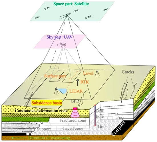 At present, a variety of modern surveying techniques are available for subsidence monitoring. Ground-based methods include Ground Penetrating Radar (GPR), Real-Time Kinematic (RTK) positioning, and level surveying; aerial methods utilize Unmanned Aerial Vehicles (UAVs); and space-based methods rely on satellite remote sensing, such as InSAR (Interferometric Synthetic Aperture Radar) [4,6,8,17,30]. These technologies collectively enable comprehensive, multi-scale monitoring from the ground, air, and space, as illustrated in Figure 5.
