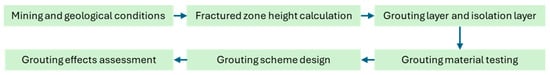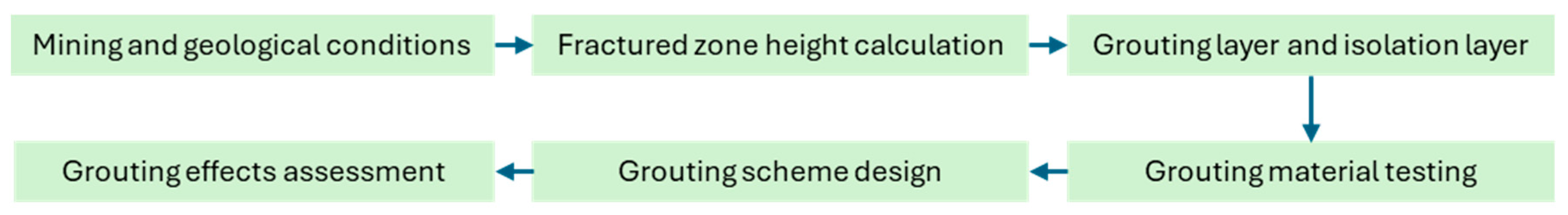 The grouting process for preventing surface subsidence in longwall mining follows a systematic workflow that begins with analyzing the mining and geological conditions and determining the fractured zone height. Accurate estimation of this height provides the fundamental basis for identifying the location of both the grout-bearing layer and the grout-isolation layer. Using either theoretical separation-distance models or widely adopted empirical equations derived from long-term field observations, the maximum height of the fractured zone can be estimated from mining thickness and overburden lithology. Once the fractured zone height is defined, the remaining overlying strata can be systematically evaluated to locate stable layers situated above the fractured zone and capable of effectively forming a grout-bearing space during mining-induced bed separation. These same strata also serve as the reference for selecting an appropriate grout-isolation layer that prevents slurry loss into the highly fractured zone.