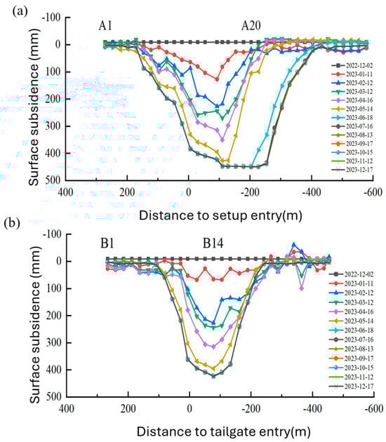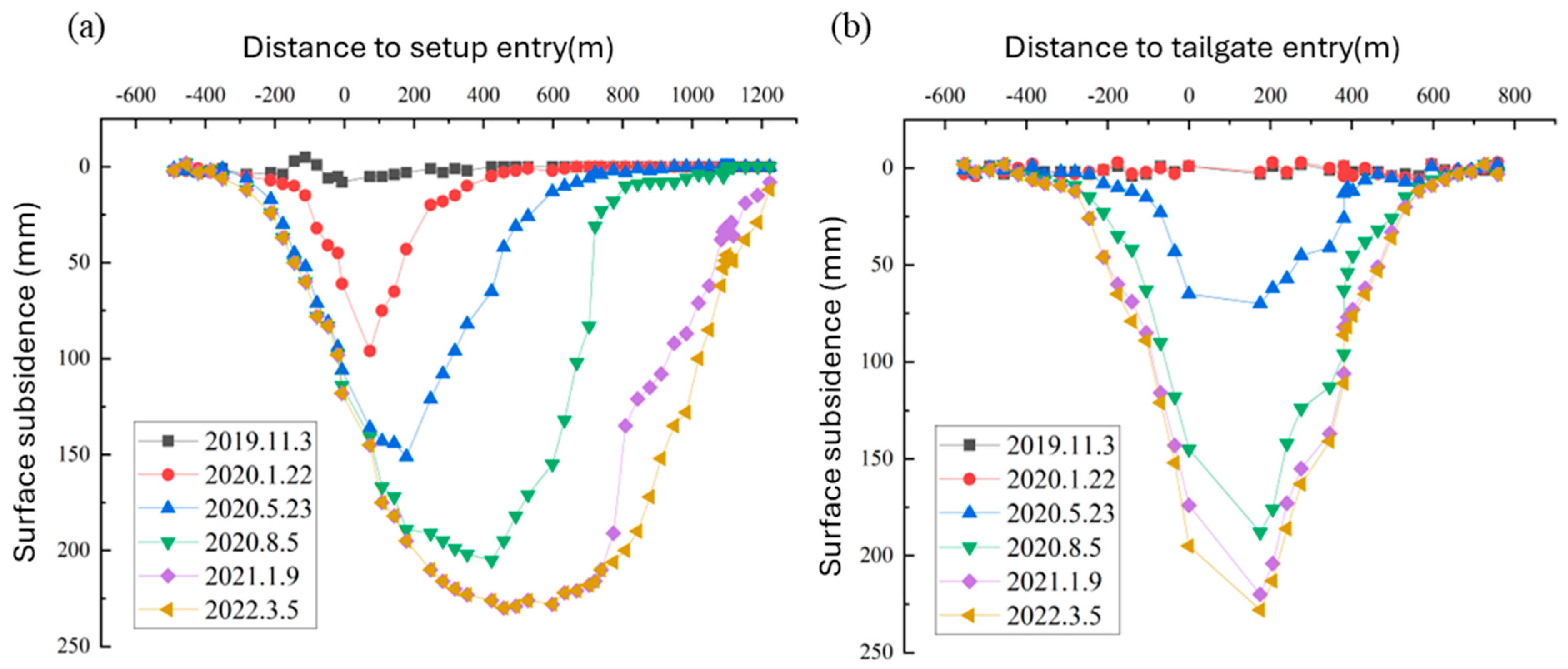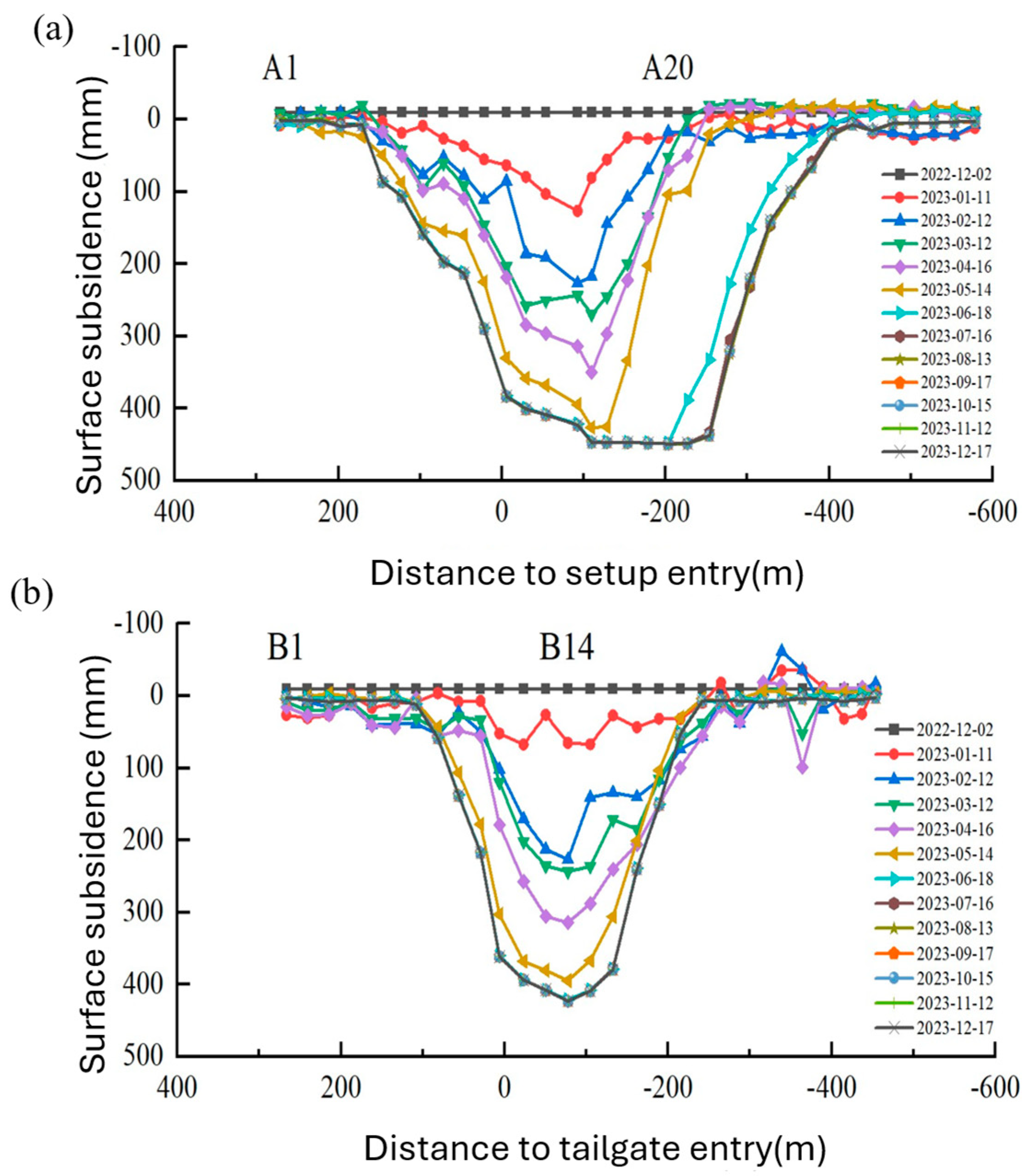 In Figure 10a, the strike-direction curves show that surface subsidence gradually increases as the No. 11090 face advances. During the first three months after the start of retreat mining in early November 2019, surface subsidence remained minor. Beginning in January 2020, the slope of the subsidence curve became significantly steeper, marking the onset of an active subsidence phase. Subsidence then accelerated until reaching its peak in May 2020, with a maximum value of 228 mm at point A19. In Figure 10b, the dip-direction subsidence curve indicates that the maximum subsidence point occurs at B24, 230 mm. After January 2021, with six months of continuous monitoring, surface deformation was observed to stabilize, and further subsidence ceased.