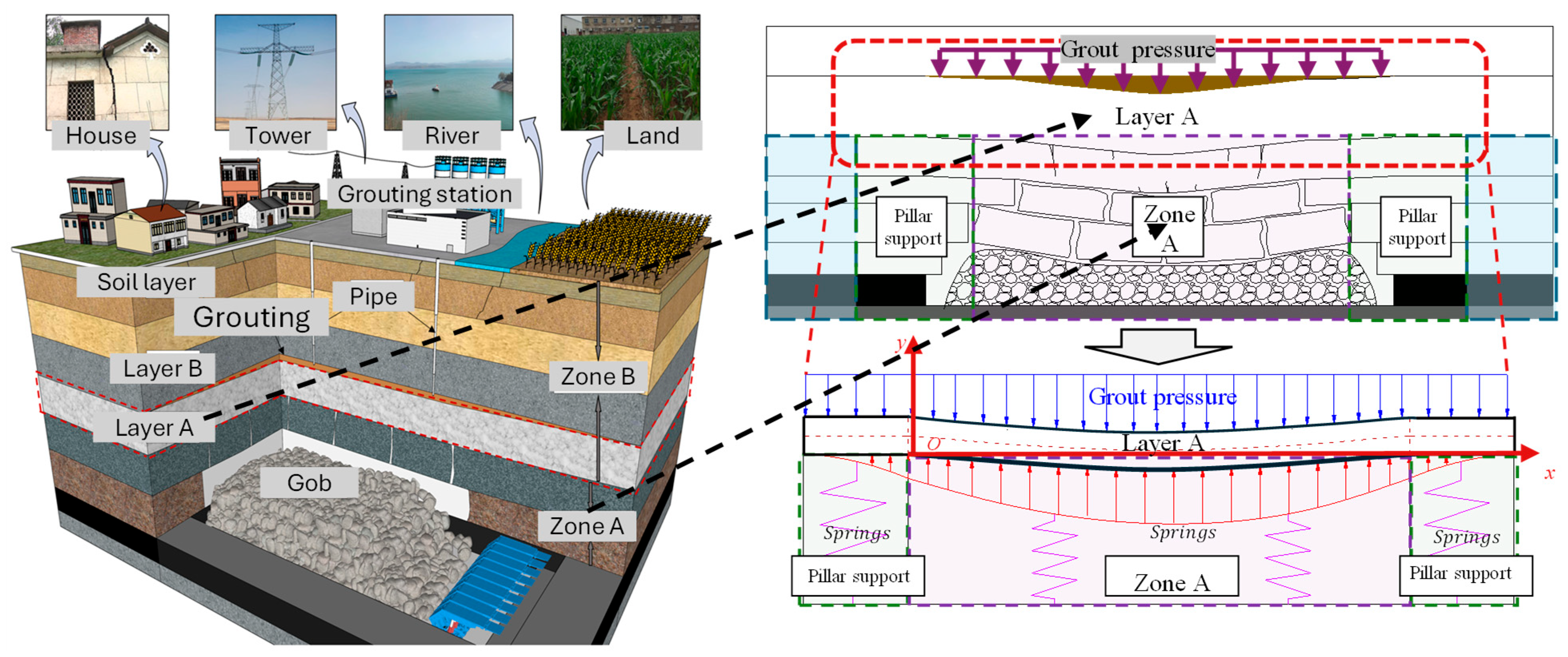 As the longwall face advances, the overlying strata move upward layer by layer, transmitting the void space of the mined-out area to beneath the grout isolation layer and providing the necessary space for its deformation. At this stage, the grout-isolation layer forms a downward-suspended, fixed-ended beam structure constrained at both ends, which bends and subsides under its own weight (Figure 3-right). As the span of the fixed-ended beam gradually increases, the bending-subsidence at the middle of the isolation layer also increases, causing asynchronous subsidence relative to the overlying key strata. Eventually, a separation grouting space is formed beneath the key strata. Filling this interlayer space with grout while maintaining a certain injection pressure supports the key strata and simultaneously reduces the height of the space below it, thereby limiting the bending-subsidence magnitude. Under the combined effect of “upward lift and downward pressure” from the grouting, the bending deformation of the isolation layer further increases, allowing the bottom of the layer to contact the underlying strata and form an elastic foundation beam structure. This structure transmits the pressure downward through the strata, further compacting the underlying mined-out area.