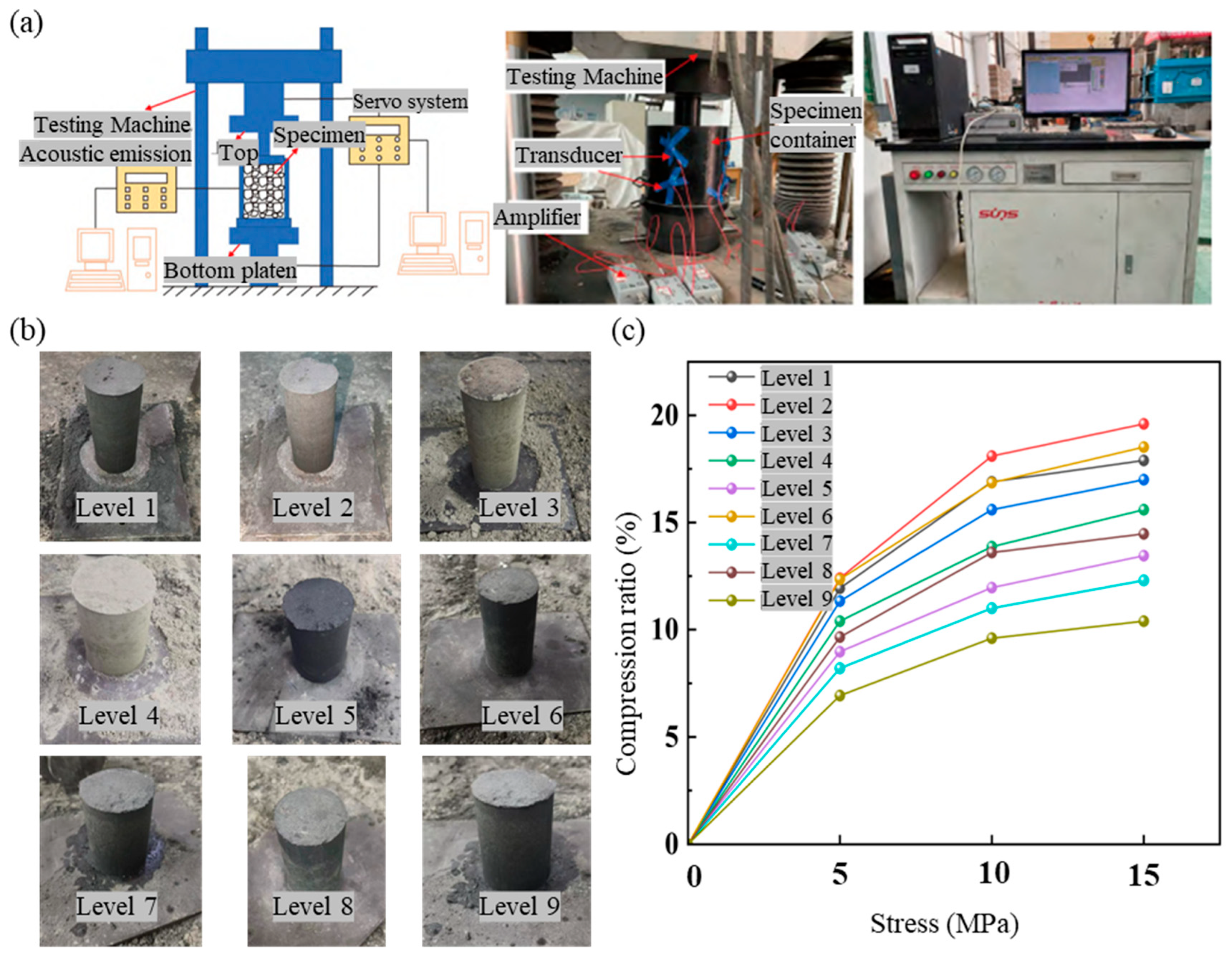 After these layers are selected, the next step is the determination and testing of the grout material. Because the injected material must sustain long-term compression under high confining pressure and cyclic loading, laboratory testing is essential for quantifying its compressibility and mechanical stability. Using industrial waste materials such as fly ash, coal gangue, and slag powder, orthogonal testing is conducted to evaluate how different mix ratios influence compressive behavior under confined loading. Through staged loading tests and analysis of strain development, the optimal mix proportion is selected to ensure adequate strength, low compression ratio, and overall material stability. This optimized grout serves as the primary medium for filling the overburden delamination space and transferring load downward to compact broken rock masses.
