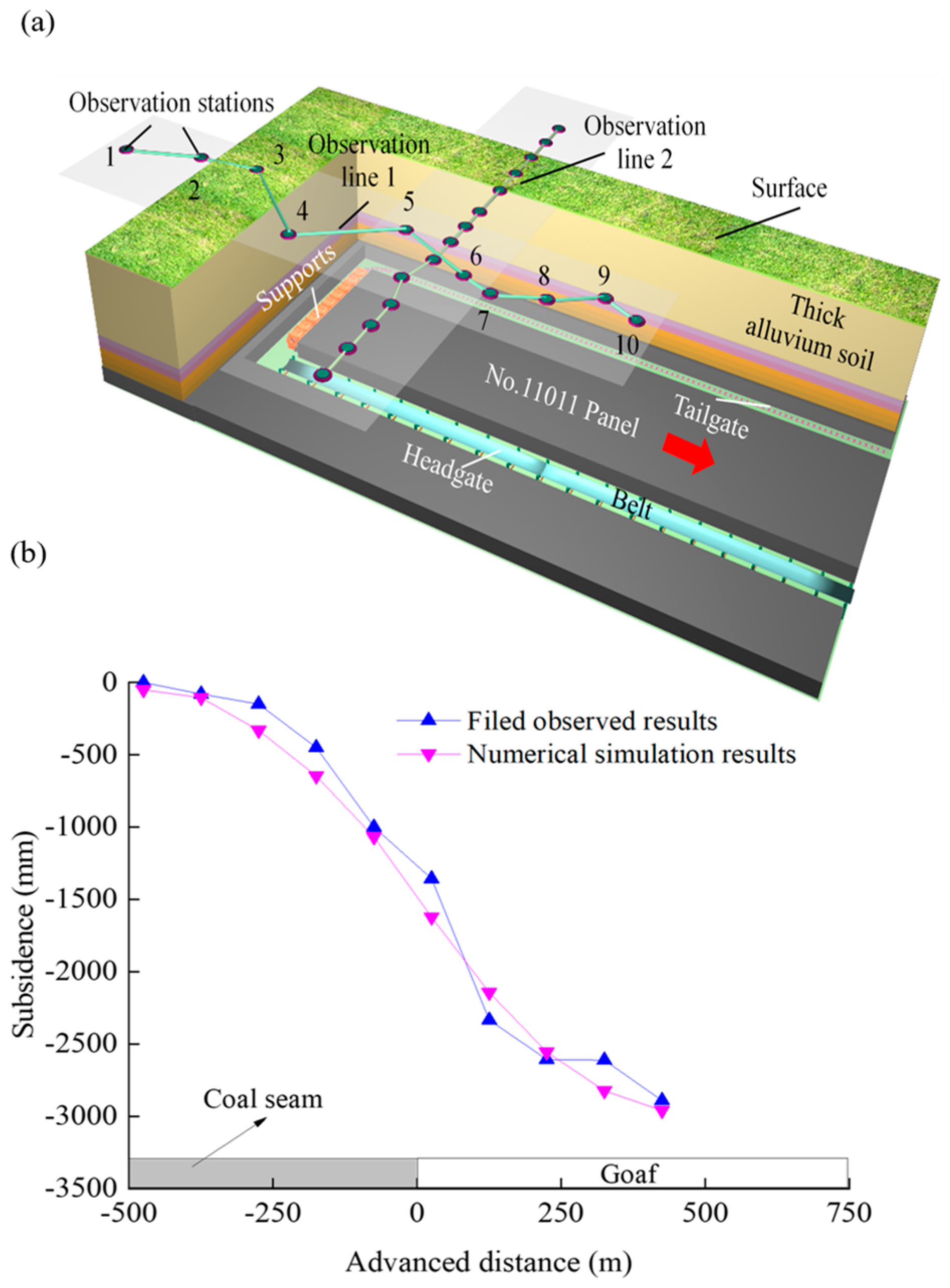 When numerical modeling is used to simulate surface deformation [9,31,32], the field-measured subsidence data from Observation Line I are commonly used for comparison and validation against numerical results, as illustrated in Figure 6b. The observed and simulated subsidence curves generally exhibit similar trends, indicating that the model effectively captures the deformation behavior of the overburden and surface.