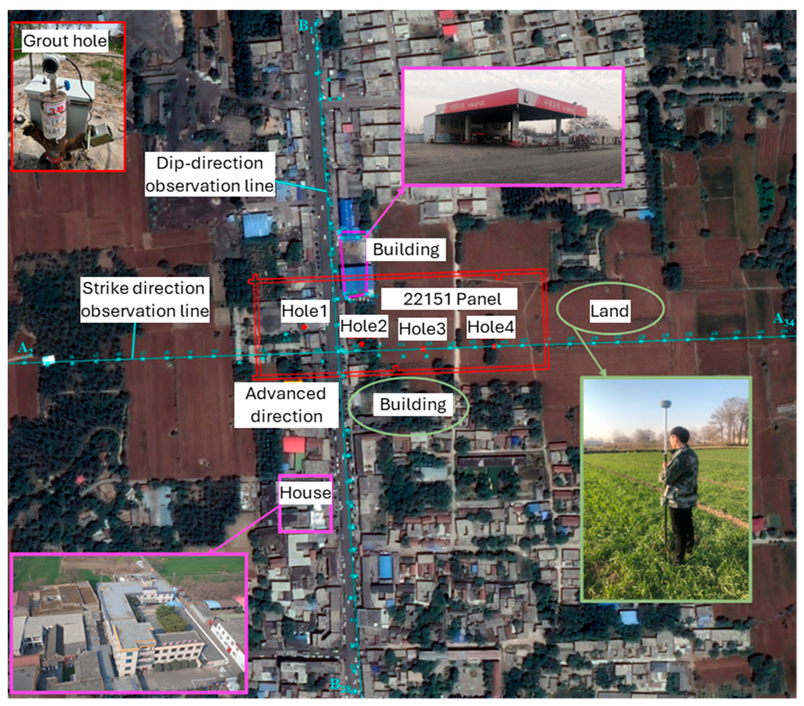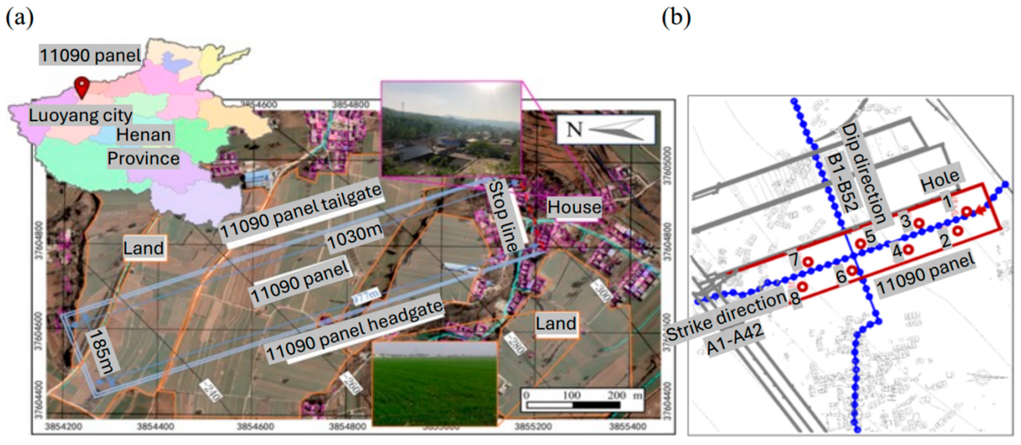 The No. 11090 longwall panel is located in Luoyang City, Henan Province, with the surface corresponding to residential buildings and roads in parts of Jinxi Village and Gu Village, and large areas of farmland overlying the longwall panel, as shown in Figure 8a. After comprehensive consideration, the protective measure of overburden delamination grouting was selected to safeguard the surface.