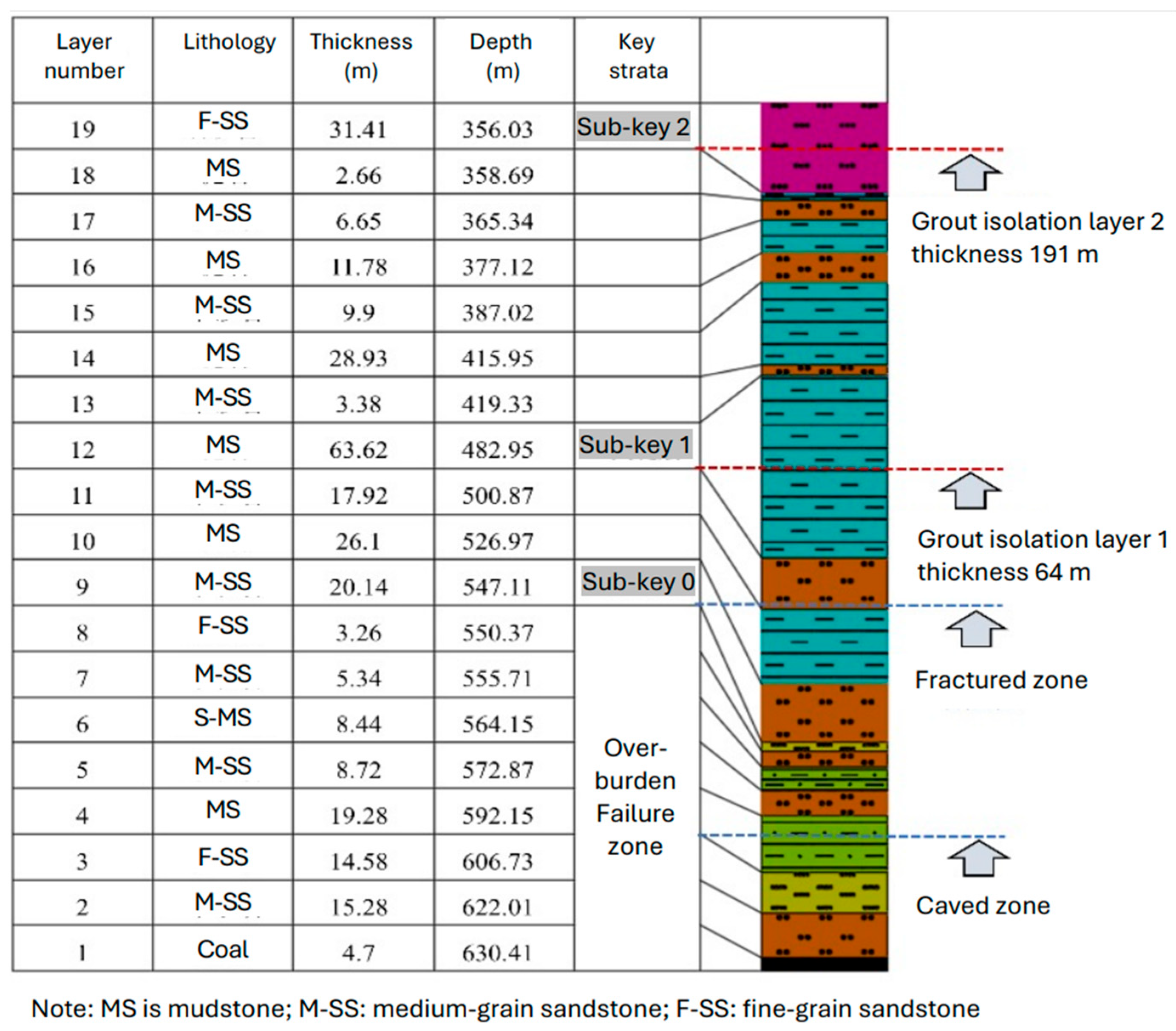 The equations in Table 2 are widely used to determine the height of the fractured zone. When applying these formulas, the lithology of the overburden should be considered, along with the uniaxial compressive strength (UCS) and thickness of each overlying rock layer. Once the fractured zone height is determined, the overlying strata can be identified. These strata are generally more stable and suitable for grout injection. The design of both the grout layer and the isolation layer will be discussed in the next chapter.