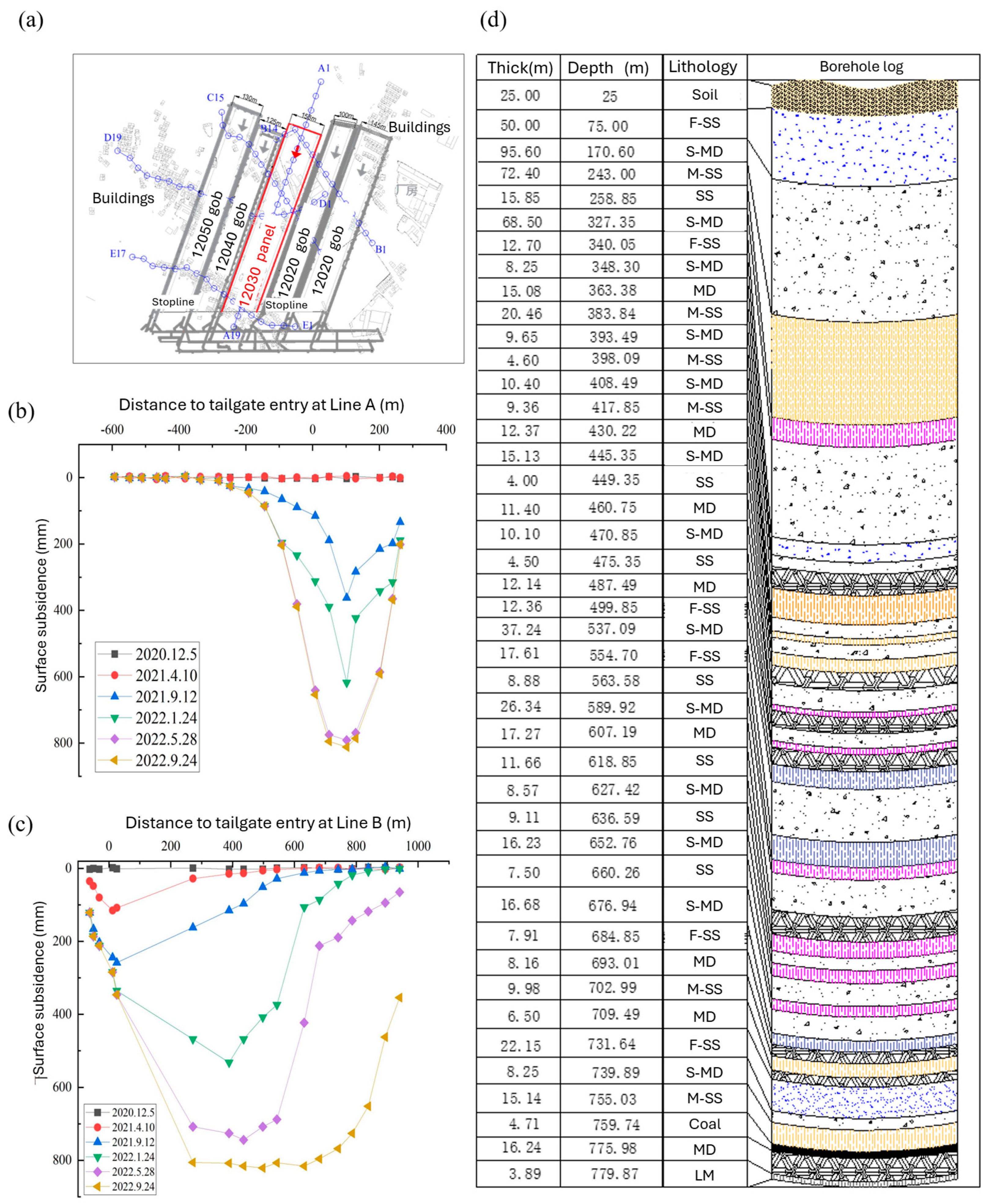 No. 12030 panel information. (a) panel layout; (b) surface subsidence along Line A; (c) surface subsidence along Line B; (d) borehole log. Note: M-SS refers to medium-grained sandstone; F-SS: fine-grained sandstone; MS: mudstone; S-MS: sandy mudstone; C-MS: carbonaceous mudstone.