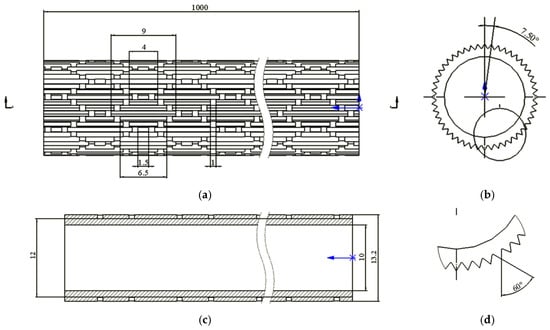 Schematic diagram of shark-skin bionic structure tube: (a) Front View; (b) Side View; (c) Section View; (d) Partial View.