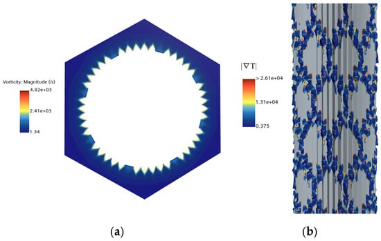 To objectively identify the structure and intensity of the secondary flow vortices, Figure 7a presents the vorticity contour plot on the axial cross-section (y/y0 = 0.5) of the bio-inspired heat exchange tube. Vorticity exhibits distinct peaks in the vicinity of the micro-ribs, reaching a maximum of 4.82 × 103 s−1. This indicates a significant enhancement in the intensity of the secondary flow vortices induced by the V-shaped ribs. Figure 7b employs a visualization method combining the Q-criterion isosurface (Q = 1.0 × 104) with the superimposed temperature gradient magnitude (∣∇T∣). This approach clearly delineates the three-dimensional vortex structure: the core region of the secondary flow vortex (the region of high Q-criterion value) spatially corresponds with the region of peak temperature gradient. Conversely, the temperature gradient is significantly lower at the periphery of the vortex structure. This spatial correspondence directly reveals the heat transfer enhancement mechanism of the vortices: the rotational motion of the vortex pumps fluid from the mainstream toward the wall, while simultaneously transporting fluid away from the near-wall region. This process facilitates efficient mixing between the hot and cold fluids.