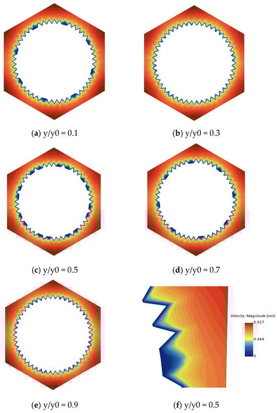 Figure 8 presents the velocity magnitude contours on axial cross-sections at dimensionless positions (y/y0 = 0.1, 0.3, 0.5, 0.7, 0.9) along the heat exchange tube. As shown in Figure 8a,b, only localized, discrete velocity peaks (approximately 0.6 m/s) are observed in the near-wall region, with a discontinuous circumferential distribution. The velocity in the mainstream region remains uniform (approximately 0.4 m/s), indicating that the disturbance induced by the V-shaped micro-ribs is in its initial stage, and the flow is in a “triggering phase.” In Figure 8c,d, the local peaks merge to form a circumferentially continuous high-velocity band, with the magnitude increasing to 0.8 m/s—a 33% increase compared to the inlet section. The mainstream region begins to exhibit slight fluctuations due to the disturbance from the secondary flow, marking a transition toward “global enhancement”. As shown in Figure 8e, the velocity magnitude distribution becomes fully consistent with that in the development region: the magnitude of the near-wall high-velocity band (0.8 m/s), the fluctuation amplitude in the mainstream region (0.05 m/s), and the velocity gradients in the radial profiles all stabilize. This indicates that the flow has entered a fully developed turbulent state.