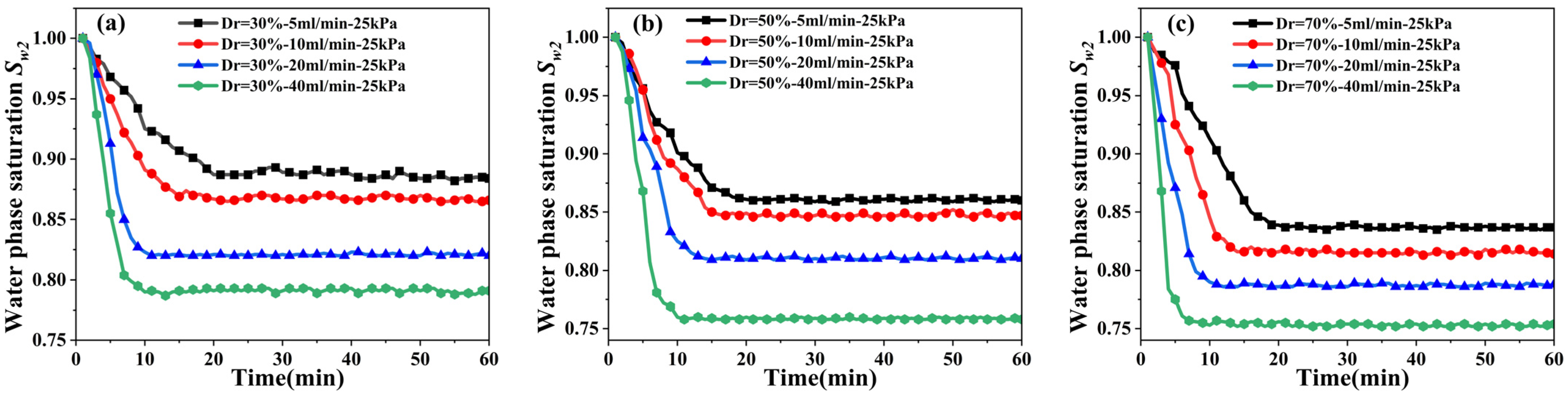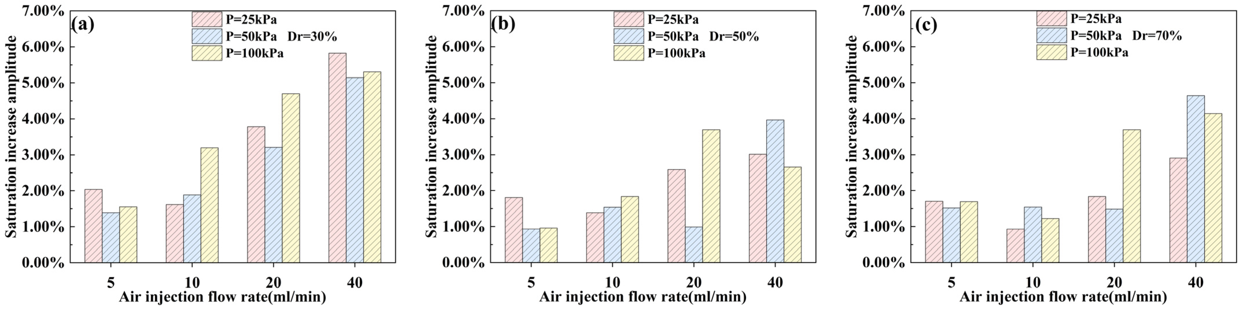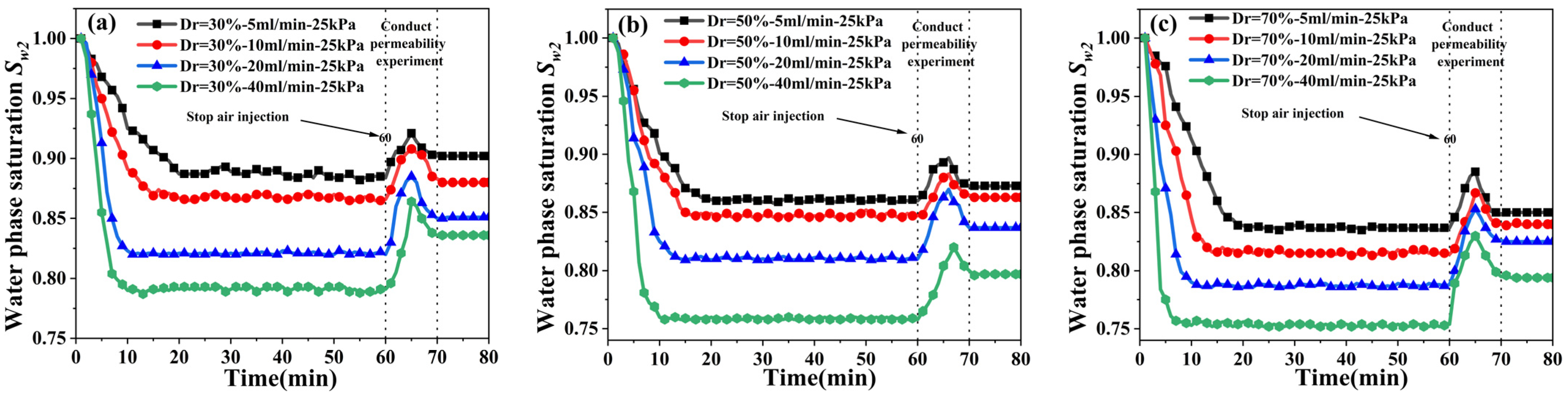 3.1. Effect of Air Injection Flow Rate on Degree of Saturation