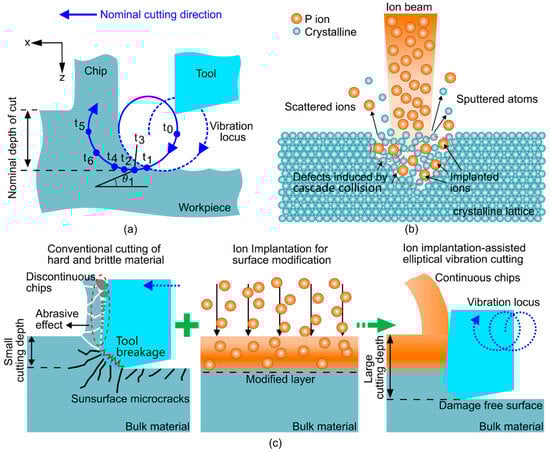 Schematic of the ion implantation-assisted elliptical vibration cutting (Ii-EVC). (a) Elliptical vibration cutting (EVC). (b) Ion implantation process. (c) Hybrid Ii-EVC process [101].
