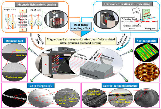 HEAs present significant challenges for ultra-precision SPDT due to their strong work hardening, chemical affinity with diamond, and tendency to induce subsurface damage. Recent advances highlight ultrasonic vibration–magnetic-field dual-field assisted diamond cutting (MUVFDC) as an effective hybrid approach to overcome these limitations. Comparative studies against no-field, magnetic-only, and ultrasonic-only diamond cutting demonstrate that MUVFDC consistently achieves the lowest surface roughness, the most uniform chip morphology, minimal tool wear, and superior subsurface integrity [42]. The synergistic enhancement arises from the complementary mechanisms of the two fields: Ultrasonic vibration introduces high-frequency intermittent tool-workpiece contact that reduces average cutting forces and temperature, suppresses continuous ploughing, and stabilizes chip segmentation; simultaneously, the magnetic field induces magneto-plasticity and eddy-current damping, reducing chatter, moderating adhesive and thermal wear, and refining grain deformation beneath the machined surface [42,60,102].