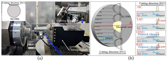 - Zhang, J.; Li, X.; Fu, Y.; Zheng, Y.; Mo, H.; Chen, X.; Xiao, J.; Xu, J. Improved machinability of single crystal silicon by applying in-situ laser-vibration hybrid assisted diamond cutting. J. Mater. Process. Technol. 2024, 326, 118343. [Google Scholar] [CrossRef]