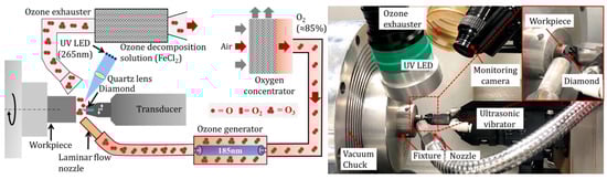 - Zhang, X.; Meng, Y.; Yang, Z.; Zhang, Z.; Ren, M.; Zhu, L. Ultraviolet-ozone assisted ultrasonic vibration cutting for extending diamond tool life. J. Mater. Process. Technol. 2022, 304, 117560. [Google Scholar] [CrossRef]