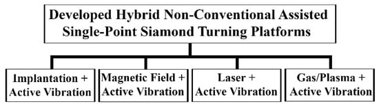 To overcome these limitations, various non-conventional assisted machining techniques have been integrated into the diamond turning process. Non-conventional assistance in SPDT refers to the use of a single energy/mechanism to support the conventional purely mechanical SPDT process. By adding external energy inputs, such as heat, active vibration, magnetic fields, or cooling gases, to the cutting zone, the machinability of hard or brittle materials can be improved. Experimental studies have demonstrated that laser-assisted machining, ultrasonic vibration assistance, magnetic field application, and cryogenic or plasma jet cooling can all improve the surface finish of the turned workpiece and extend the life of the diamond tool [29,30,31]. Hybrid SPDT is a machining approach that simultaneously integrates two or more non-conventional assistance techniques with diamond turning, combining multiple mechanisms within a single operation. For example, a laser-assisted diamond turning process can be supplemented with ultrasonic vibration to intermittently separate the tool from the workpiece, thereby reducing heat build-up and tool wear. By independently controlling several energy-based assistance methods at once, hybrid SPDT systems can achieve synergies that significantly enhance performance. These benefits may include higher material removal rates, longer tool life, finer surface roughness, and improved dimensional accuracy compared to conventional SPDT [30,32,33,34].