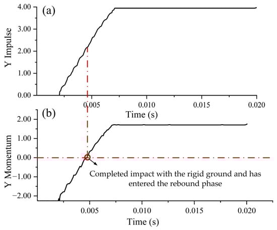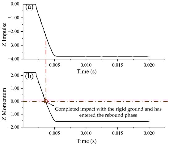 The momentum curve for the face B drop of the packaging structure is shown in Figure 14. The energy evolution is broadly similar to that of the face A drop, with the difference that the drop direction here aligns with the positive Z-axis of the software’s built-in coordinate system. As seen in the figure, because the drop direction is along the positive Z-axis, the package’s momentum and impulse in the X and Y directions are both zero. The initial momentum of the package is positive; as the package falls, the magnitude of the momentum gradually decreases, while the impulse begins to increase. When the momentum curve crosses zero on the vertical axis and then increases in the negative Z direction, it indicates that the package has completed impact with the rigid ground and has entered the rebound phase.