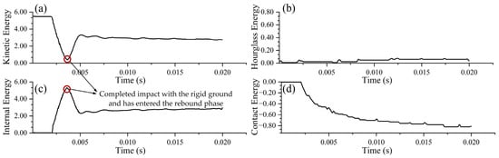 The energy curve of the face A drop is shown in Figure 13. From the figure, during the drop of the packaging structure, the internal energy curve and the kinetic energy curve remain unchanged at the beginning, because the package is still in free fall and has not yet contacted the ground. Subsequently, the internal energy begins to rise and the kinetic energy decreases; finally, the internal energy falls while the kinetic energy increases. This indicates that, after impact with the ground, the HL-1029 encapsulant starts to compress and the impact velocity begins to drop; once the encapsulant is compressed to a certain extent, the package rebounds. The two curves exhibit symmetric trends, consistent with the theoretical analysis of energy changes during the package drop, as shown in Figure 13a,c. According to the criterion that the ratio of system hourglass energy to system internal energy must be less than 10% for the results to be reliable, the face A drop yields a ratio of 0.700%, satisfying the reliability requirement.