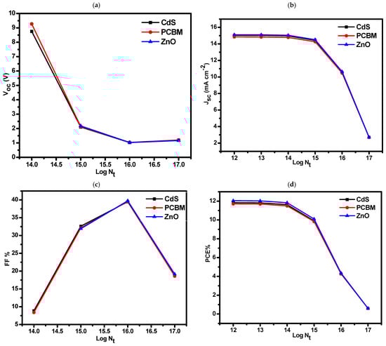 In Figure 5, as the defect density (Nt) increases from 1012 to 1017 cm−3, the fill factor (FF) initially rises slightly and then declines sharply. This behavior likely occurs because low defect densities support charge collection, leading to an improvement in FF; however, as Nt increases beyond 1014, the buildup of defects hinders charge extraction, resulting in FF degradation. This trend aligns with findings in other studies, which observed similar FF trends due to recombination effects at higher defect levels [36].