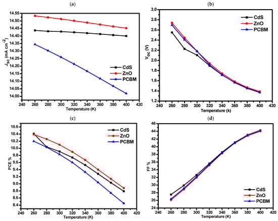 Temperature dependence of key photovoltaic parameters for BaZr(S0,6Se0,4)3–based perovskite solar cells employing different ETLs: (a) Jsc, (b) Voc, (c) PCE%, and (d) FF%, illustrating the influence of thermal effects on carrier recombination, transport, and overall device efficiency.