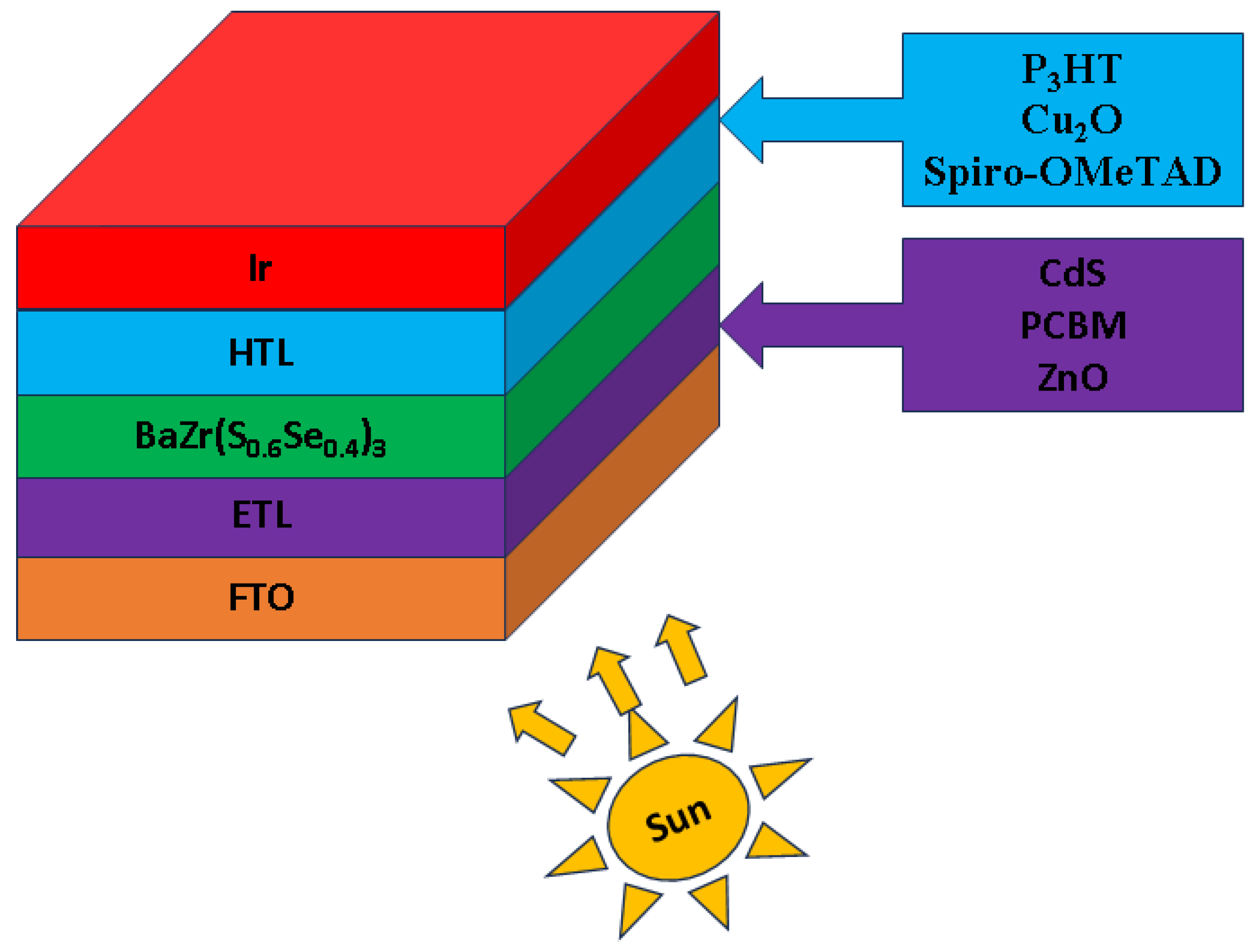 3/HTL/Ir, where different electron transport layers (ETLs), CdS, PCBM, and ZnO were analyzed alongside the BaZr(S