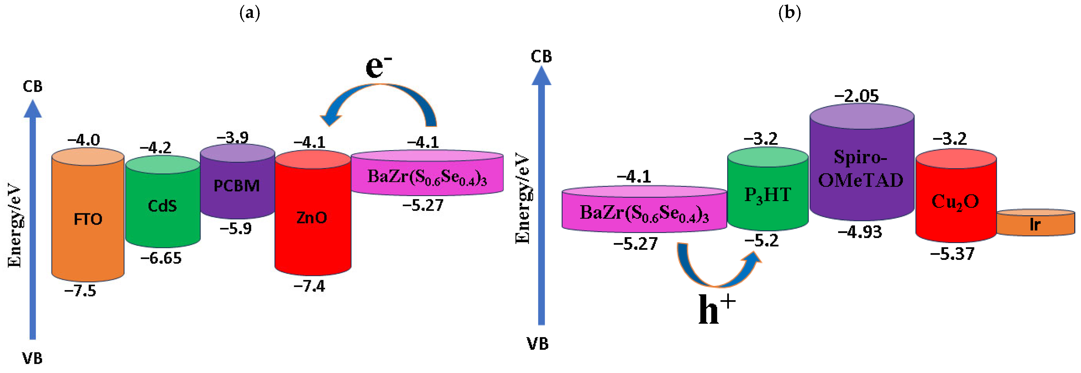 Figure 2b depicts the alignment between the absorber and the various HTLs interfacing with the high–work–function Ir back contact. These diagrams clarify the energetic driving forces for charge extraction in the proposed structures.