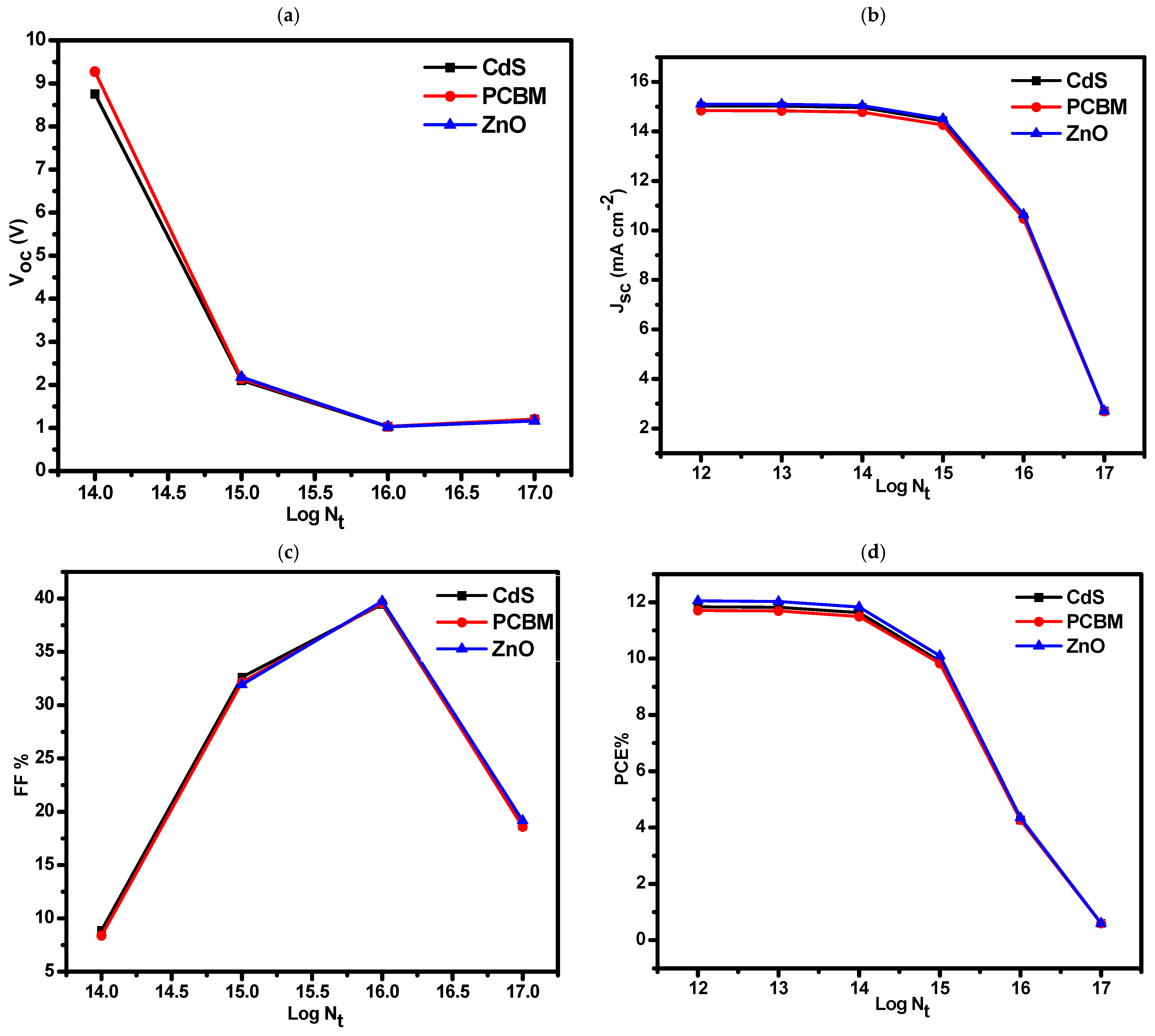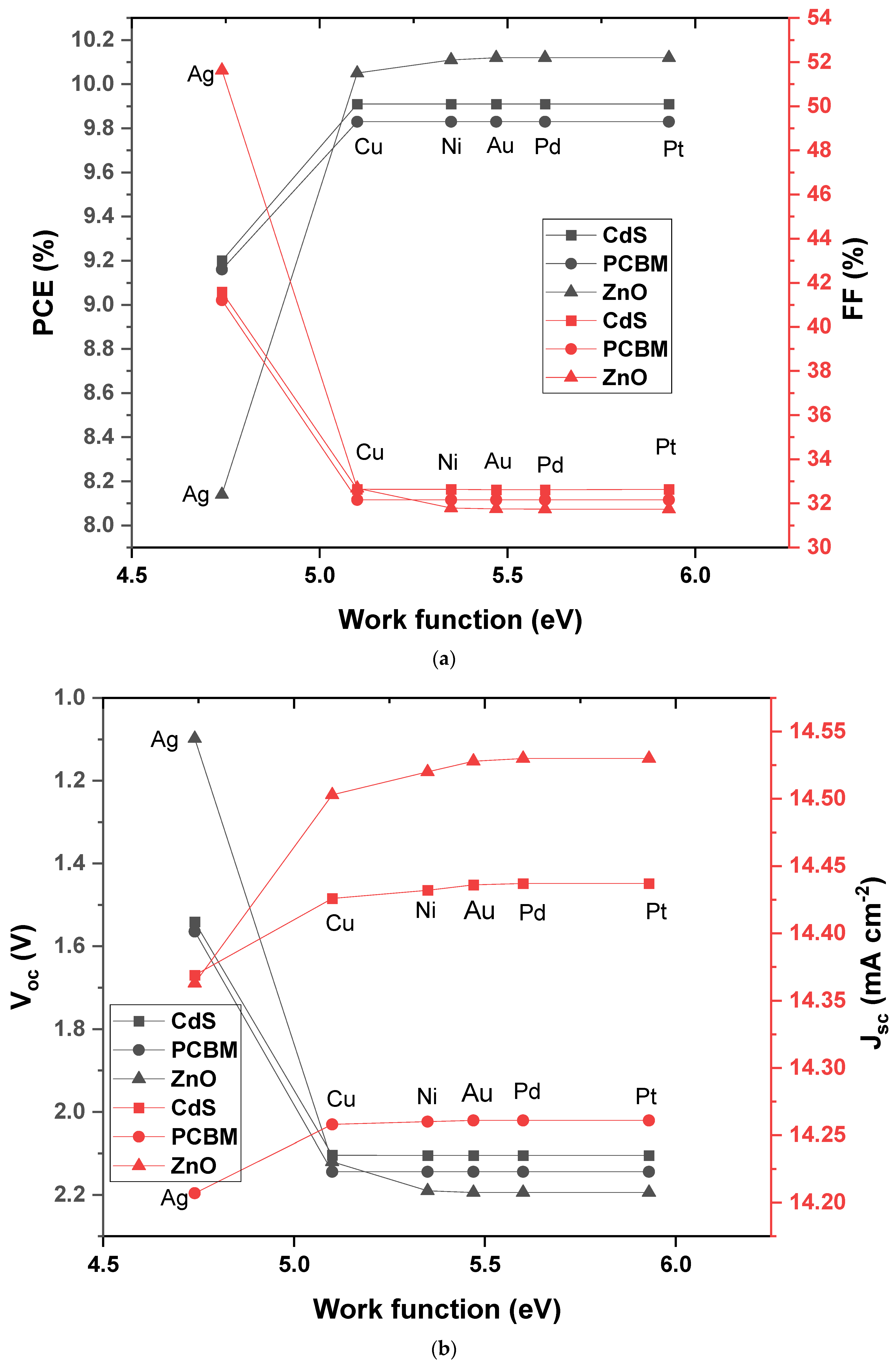 For FF, Ag results in a higher FF of 41.58%, while the other metals show FF values between 32.62 and 33.64. This could be because Ag, despite limiting PCE, provides improved conductivity at the back contact, slightly enhancing the FF. When using PCBM, Ag maintains this trend with a PCE of 9.16% and an FF of 41.21%, while the other metals yield a slightly higher PCE of 9.83% and a lower FF around 32.16%. Studies by Zhou et al. (2022) report similar behavior, where Ag’s high conductivity contributes to improved FF but limited PCE due to suboptimal energy alignment with PCBM [
