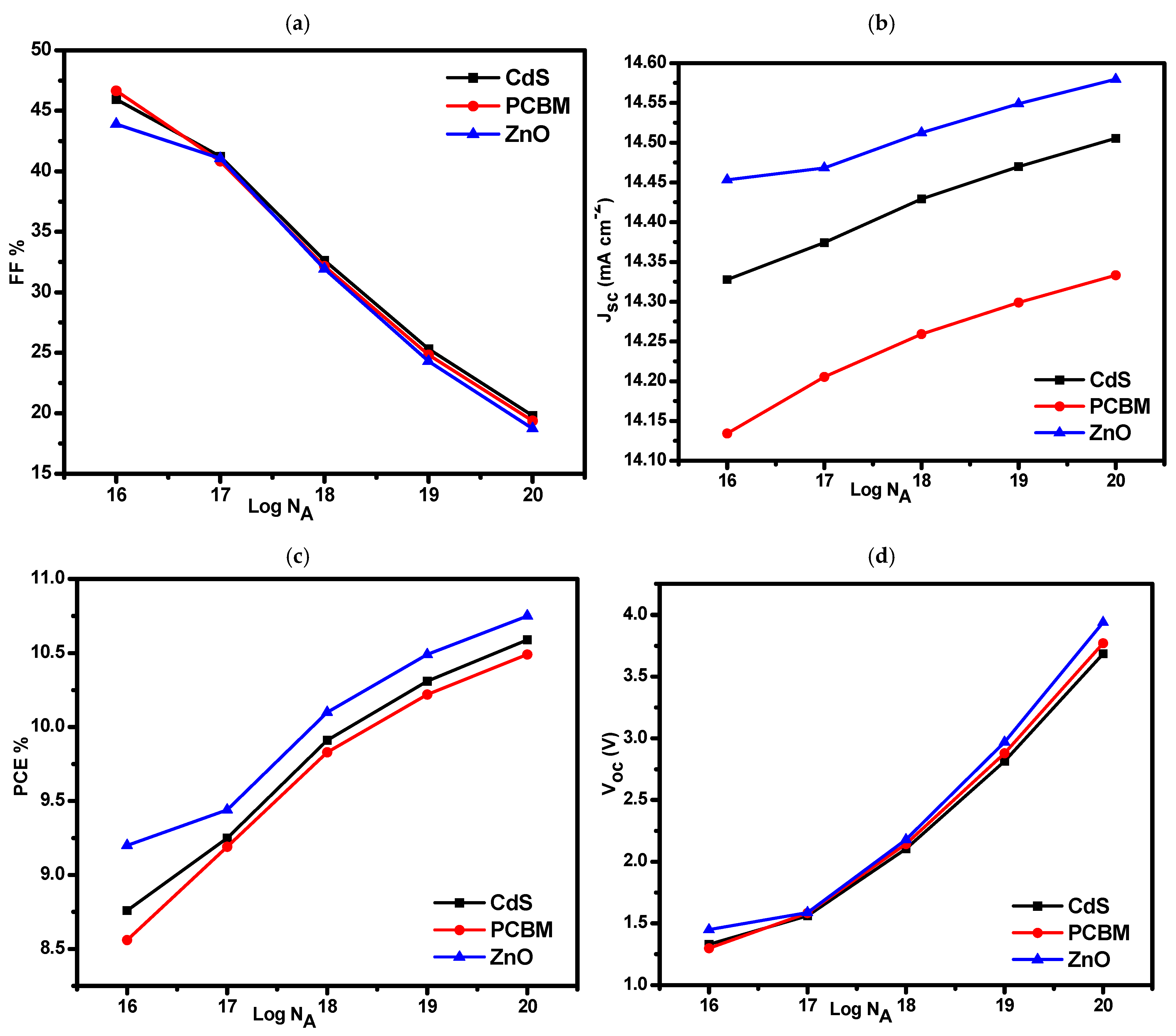 oc. The slight decrease in FF at higher NA values aligns with known mobility–related effects: with elevated doping, carrier–carrier scattering becomes more pronounced, reducing mobility and contributing to resistive losses within the device. These trends are consistent with established doping–dependent recombination and mobility behaviors reported in chalcogenide and perovskite semiconductors, where increasing doping strengthens the built–in field but can also introduce mobility limitations and non–radiative pathways at high concentrations. Similar doping–dependent behavior has been reported in other SCAPS–1D studies, where variations in absorber carrier concentration strongly affect V