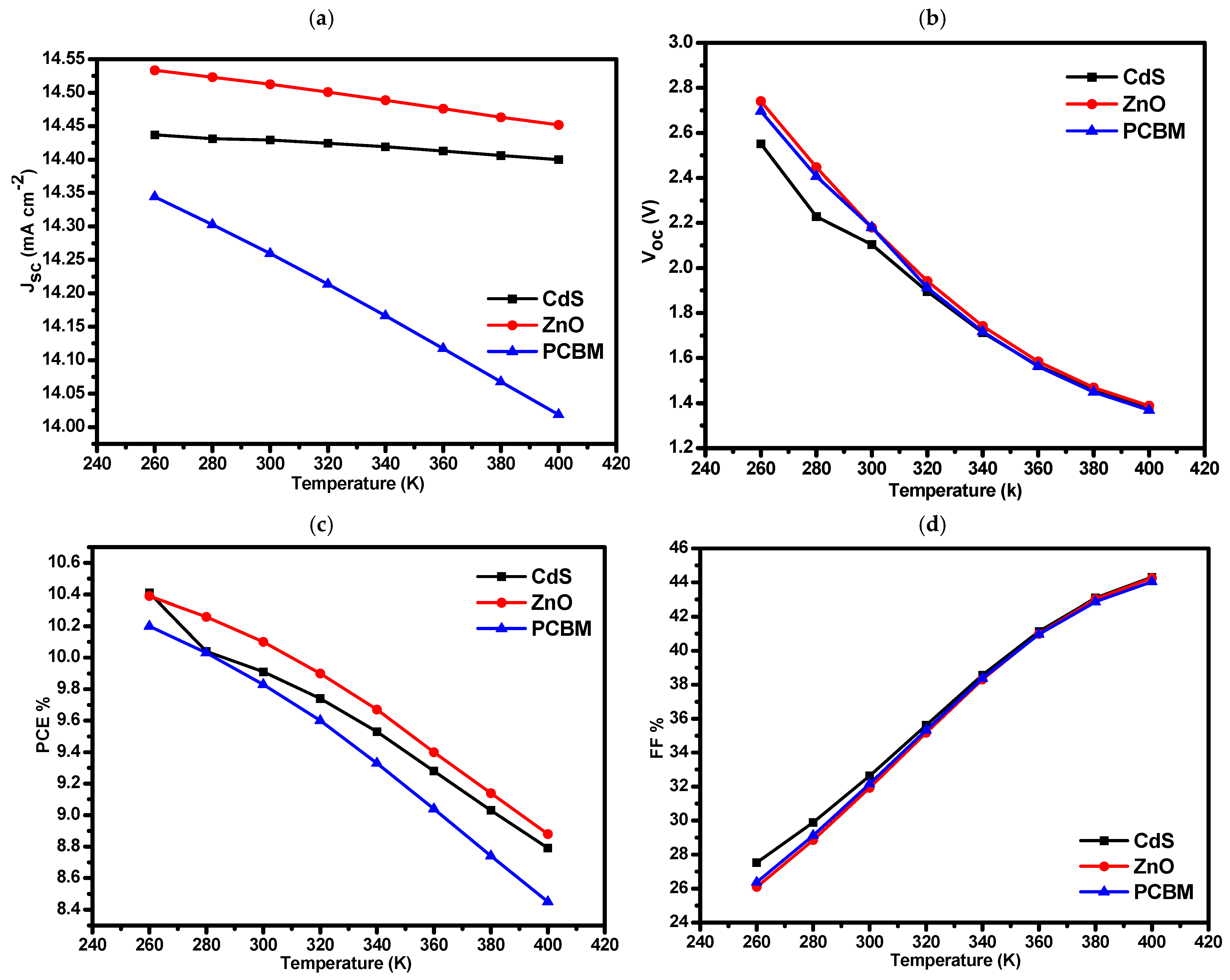 50] noted that higher temperature improves FF through enhanced carrier mobility, but the simultaneous reduction in V