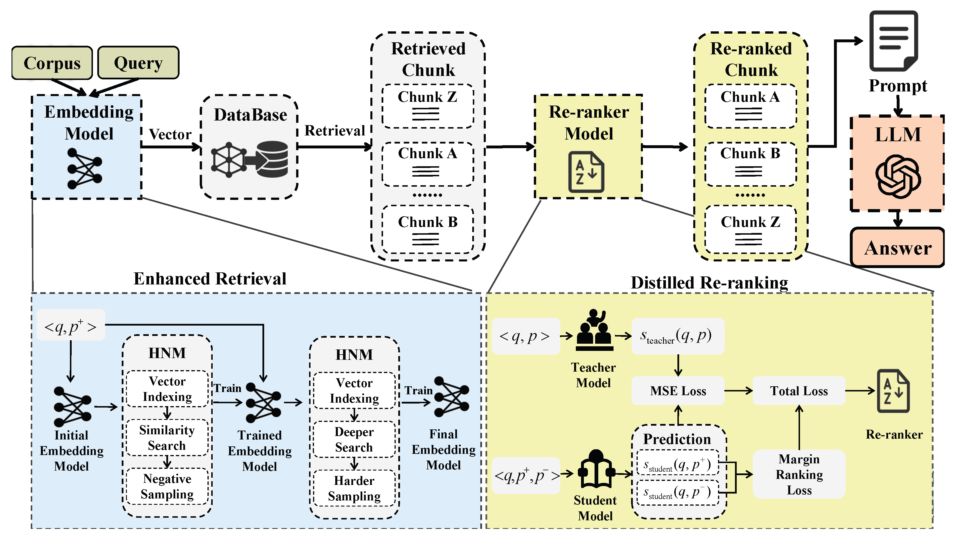 Knowledge distillation for re-ranking: Building upon the enhanced retriever, we introduce a novel re-ranking mechanism. We utilize a powerful LLM as a teacher and distill its sophisticated ranking knowledge into a lightweight BERT-based student model. This process is guided by a carefully designed hybrid loss function that combines MSE loss and margin ranking loss, providing a computationally practical yet highly effective re-ranking solution.