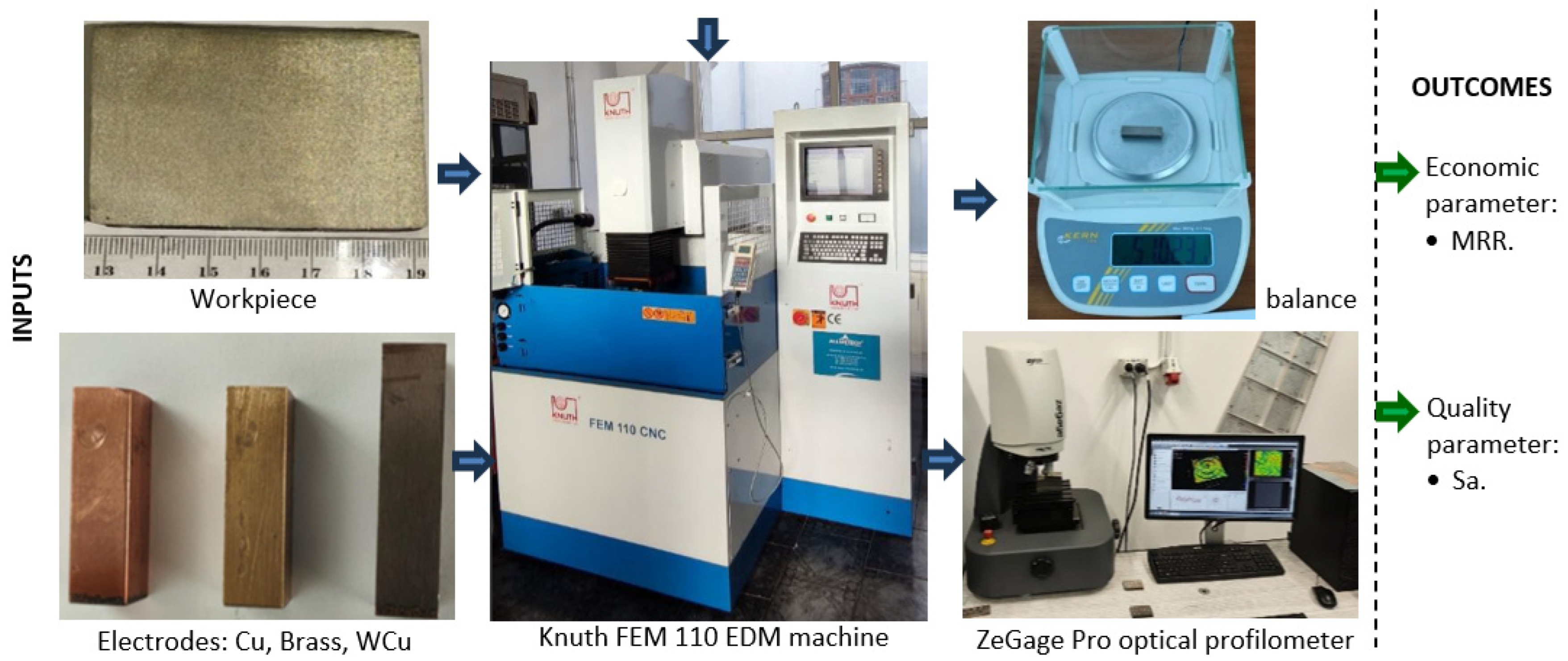 - Hanif, M.; Ahmad, W.; Hussain, S.; Jahanzaib, M.; Shah, A.H. Investigating the Effects of Electric Discharge Machining Parameters on Material Removal Rate and Surface Roughness on AISI D2 Steel Using RSM-GRA Integrated Approach. Int. J. Adv. Manuf. Technol. 2019, 101, 1255–1265. [Google Scholar] [CrossRef]